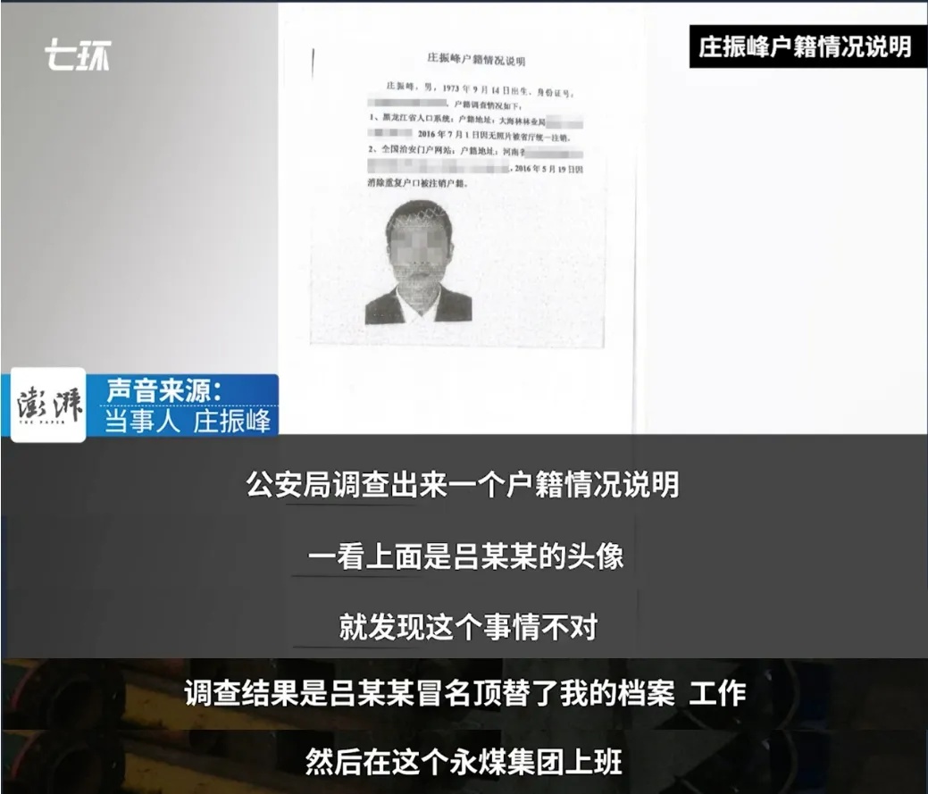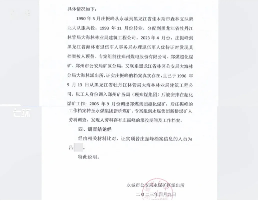 2023年4月9日,永城市公安局永煤矿区派出所出具的情况说明显示:庄振峰1996年9月从黑龙江牡丹江林管局大海林林业局建筑工程公司,以工人身份调入郑州矿务局,后被安排在超化煤矿工作,2006年9月调出,后档案转至永煤集团新桥煤矿。经比对,证实顶替庄振峰档案信息人员为吕某某。