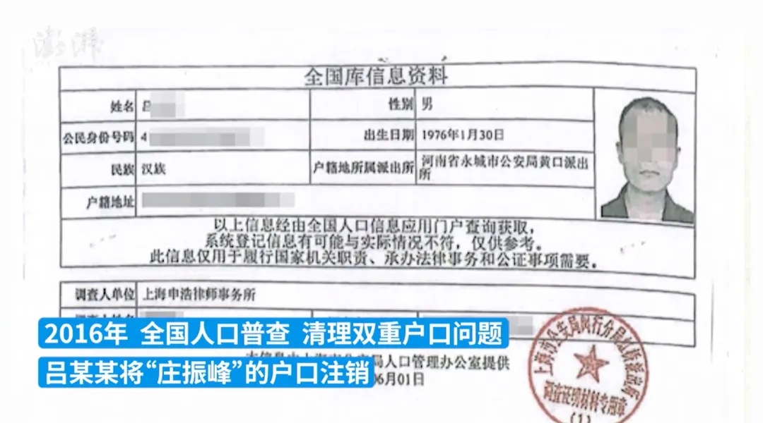 2016年,全国人口普查,清理双重户口问题,吕某某将“庄振峰”的户口注销,在家人面前他又变回了吕某某。