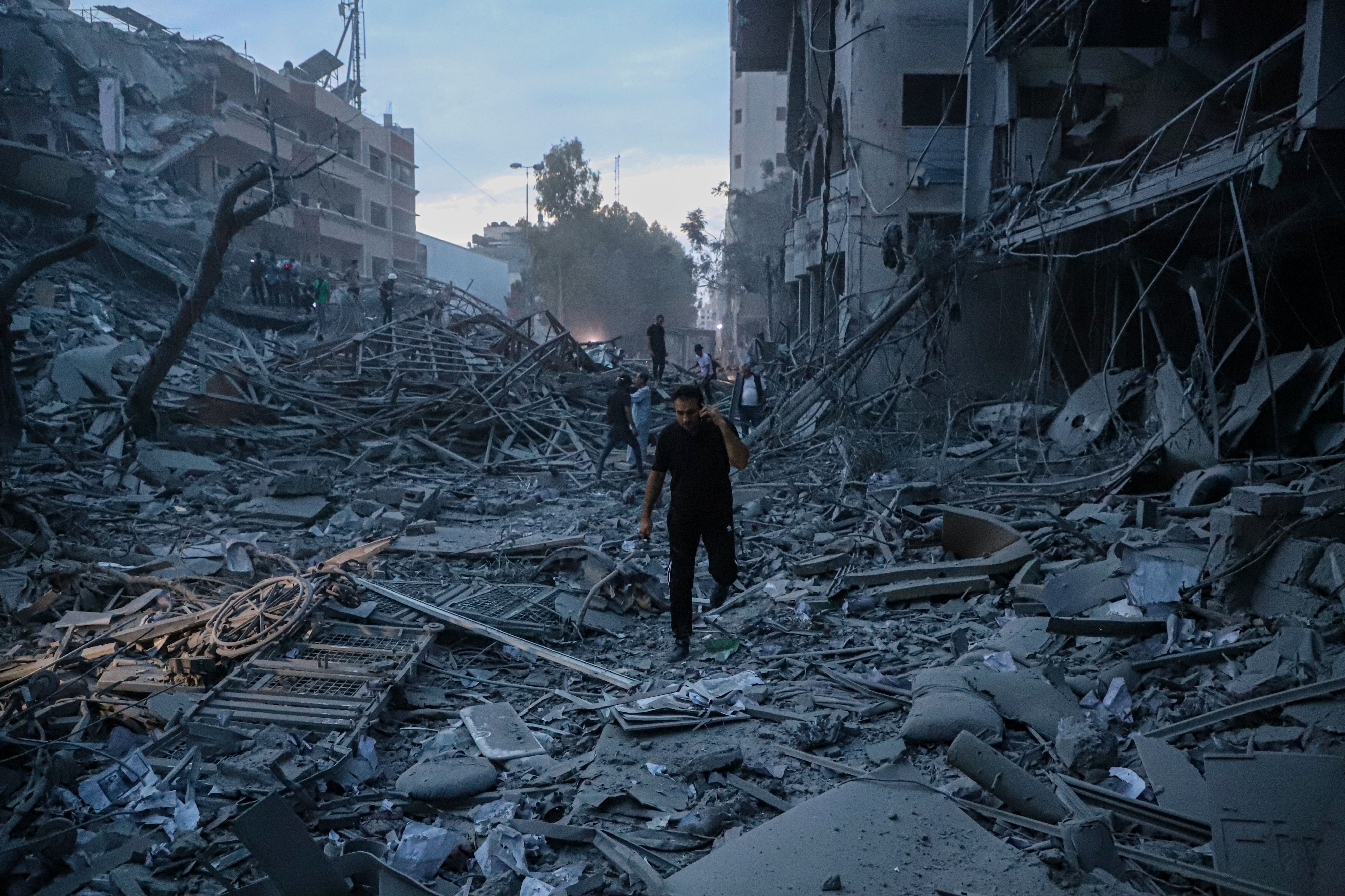 10月7日,巴勒斯坦民众在加沙城查看以色列空袭后毁坏的民宅。新华社发