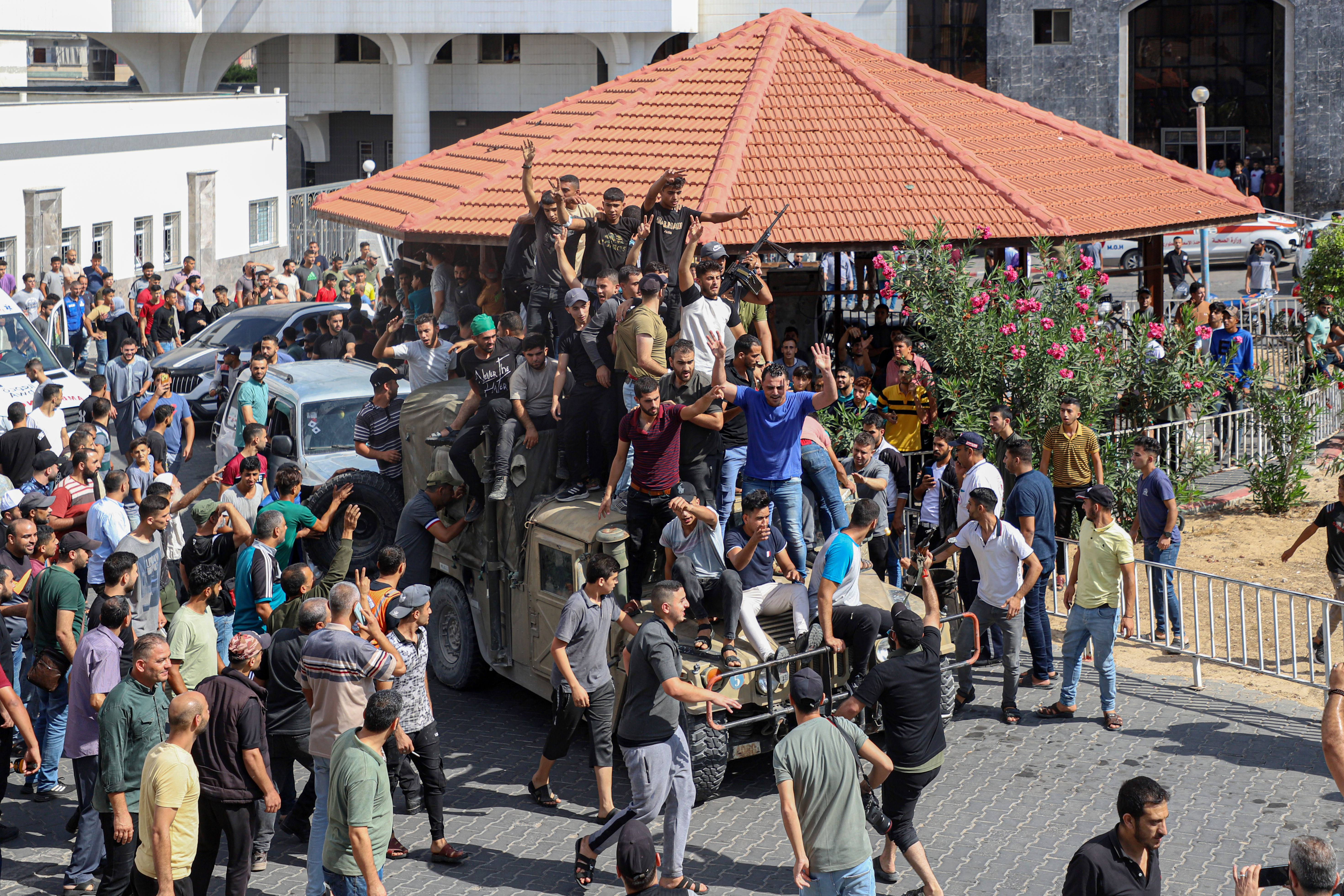 10月7日,在加沙城,巴勒斯坦人登上一辆以色列军用车辆。新华社发