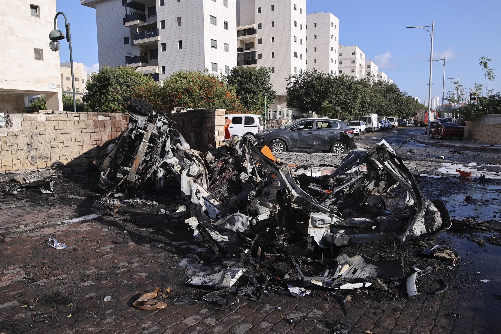 10月7日在以色列南部城市阿什克隆拍摄的遭火箭弹破坏的车辆。新华社发