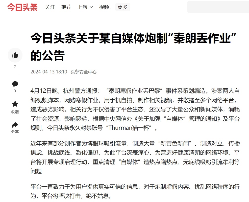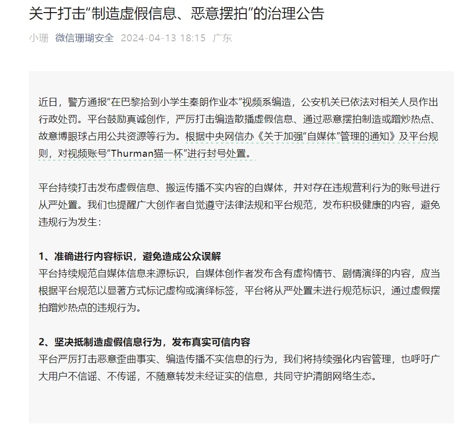 @微博管理员 4月13日消息,微博一直致力于营造和谐、健康、美好的社区氛围,鼓励用户在平台创作或分享优质、真实的内容。近期,自媒体账号@Thurman猫一杯_ 为吸粉引流,人为策划、编造“在法国巴黎拾到小学生秦朗丢失的作业本”不实视频并散播至多个网络平台,警方已对其涉嫌传播网络谣言行为作出行政处罚。该编造虚假视频行为严重损害网络生态秩序并浪费公共资源,对此,站方予以严肃处置: