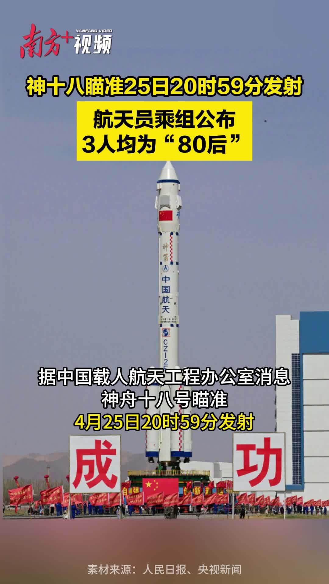 神十八瞄准25日20时59分发射,航天员乘组公布,3人均为“80后”
