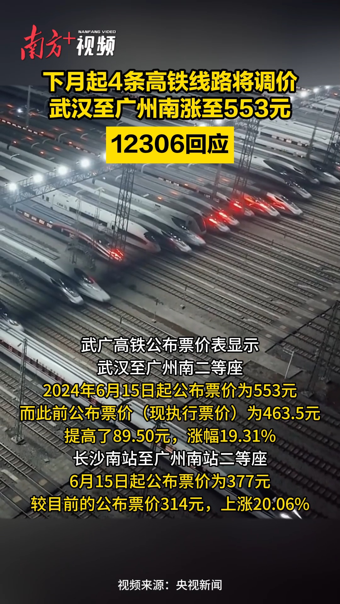 下月起4条高铁线路将调价武汉至广州南涨至553元,12306回应