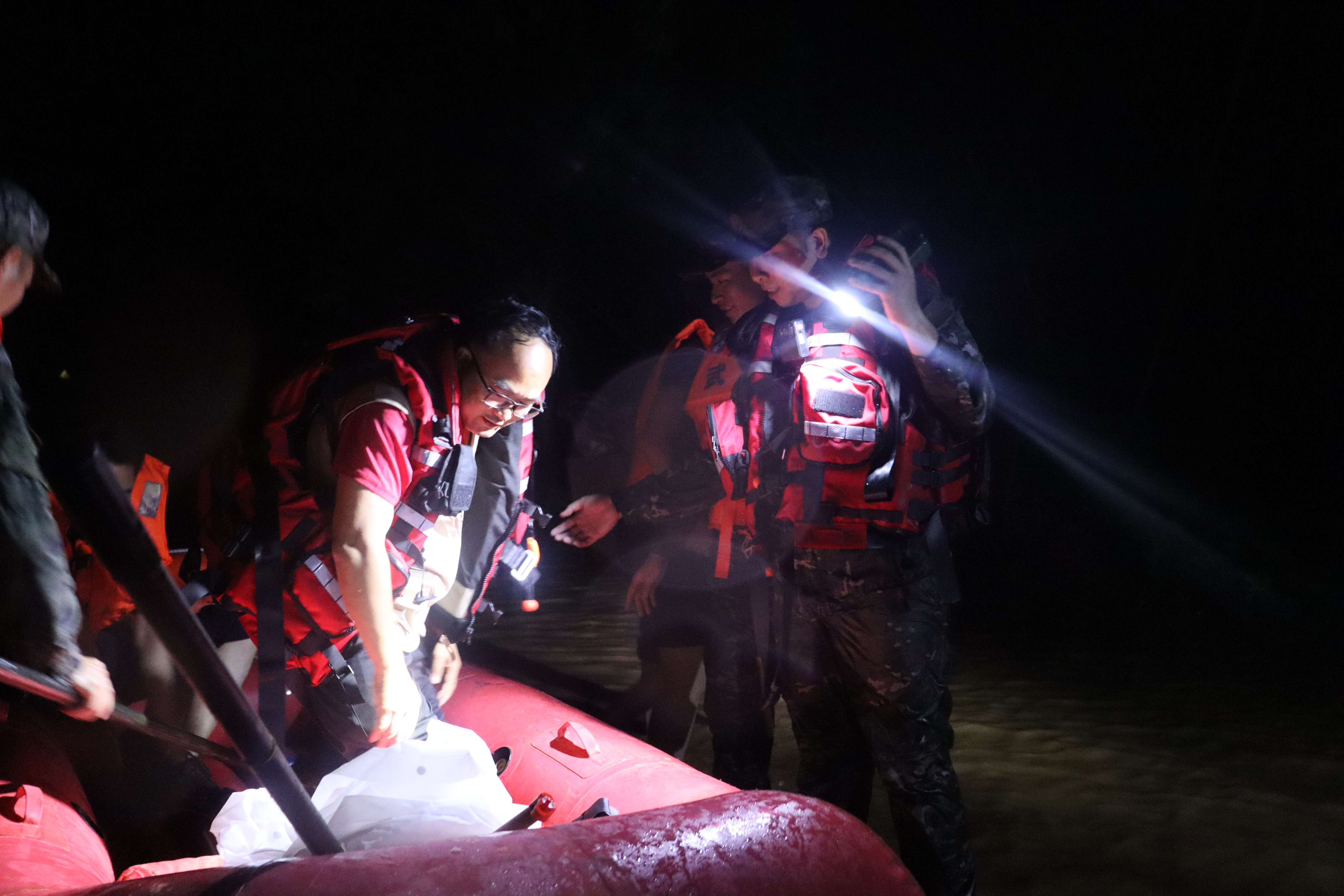夜色渐黑,村庄里电力、通信早已中断,为了不落下任何一名群众,官兵们借着手电灯光挨家挨户敲门、搜寻。