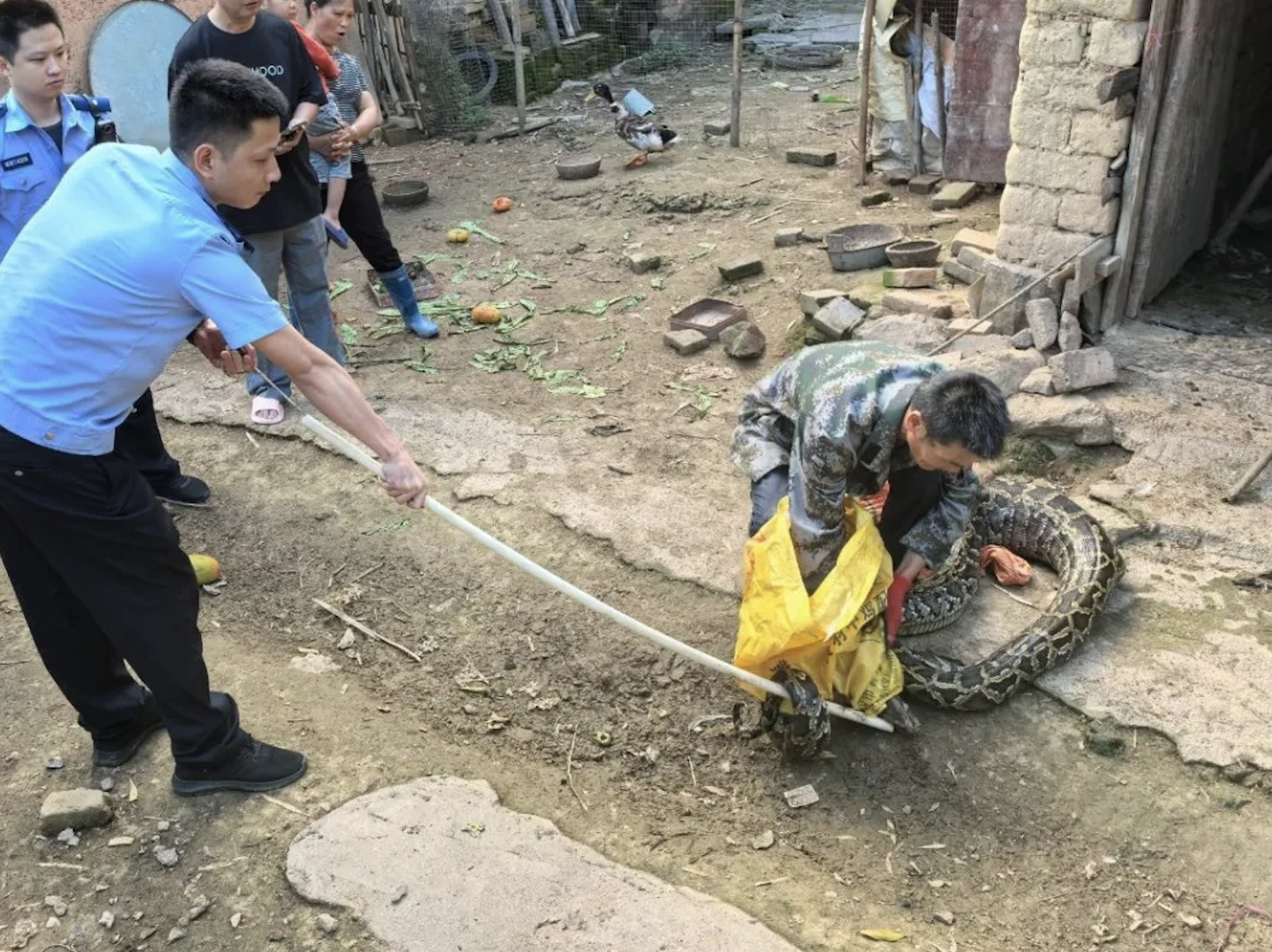 梅州村民鸡舍惊现50斤重蟒蛇,已放生!