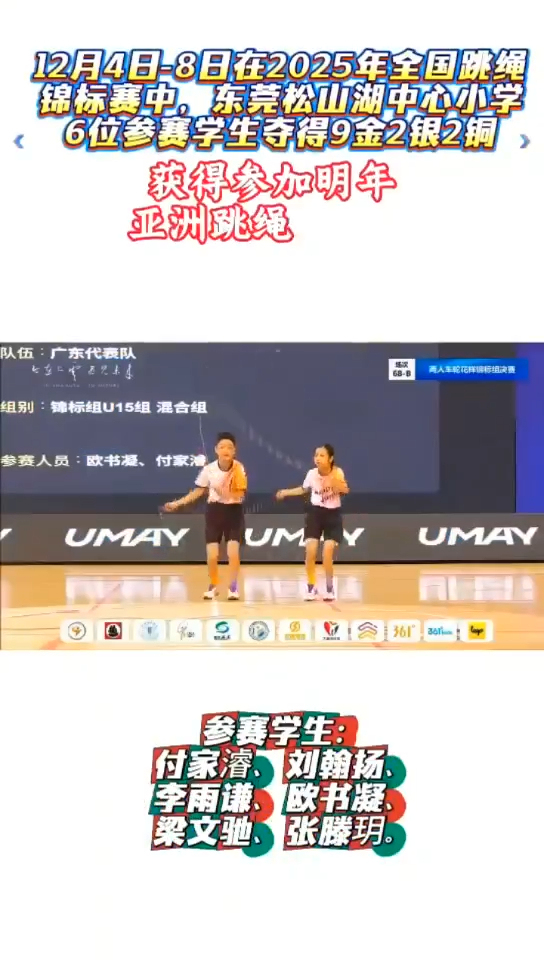 12月4日至8日,在全国跳绳锦标赛上,来自东莞松山湖中心小学的付家濬、刘翰扬、李雨谦、欧书凝、梁文驰、张滕玥6名学生代表广东省出战。他们在全国24个省(区、市)82支队伍、约1600名选手中脱颖而出,取得9金2银2铜的亮眼成绩,并凭借这一优异表现,成功获得了2026年亚洲跳绳锦标赛中国国家队的竞选资格。