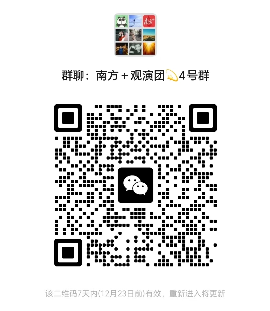 扫码加入南方+观演团微信群,第一时间获取各类演出信息↓↓↓