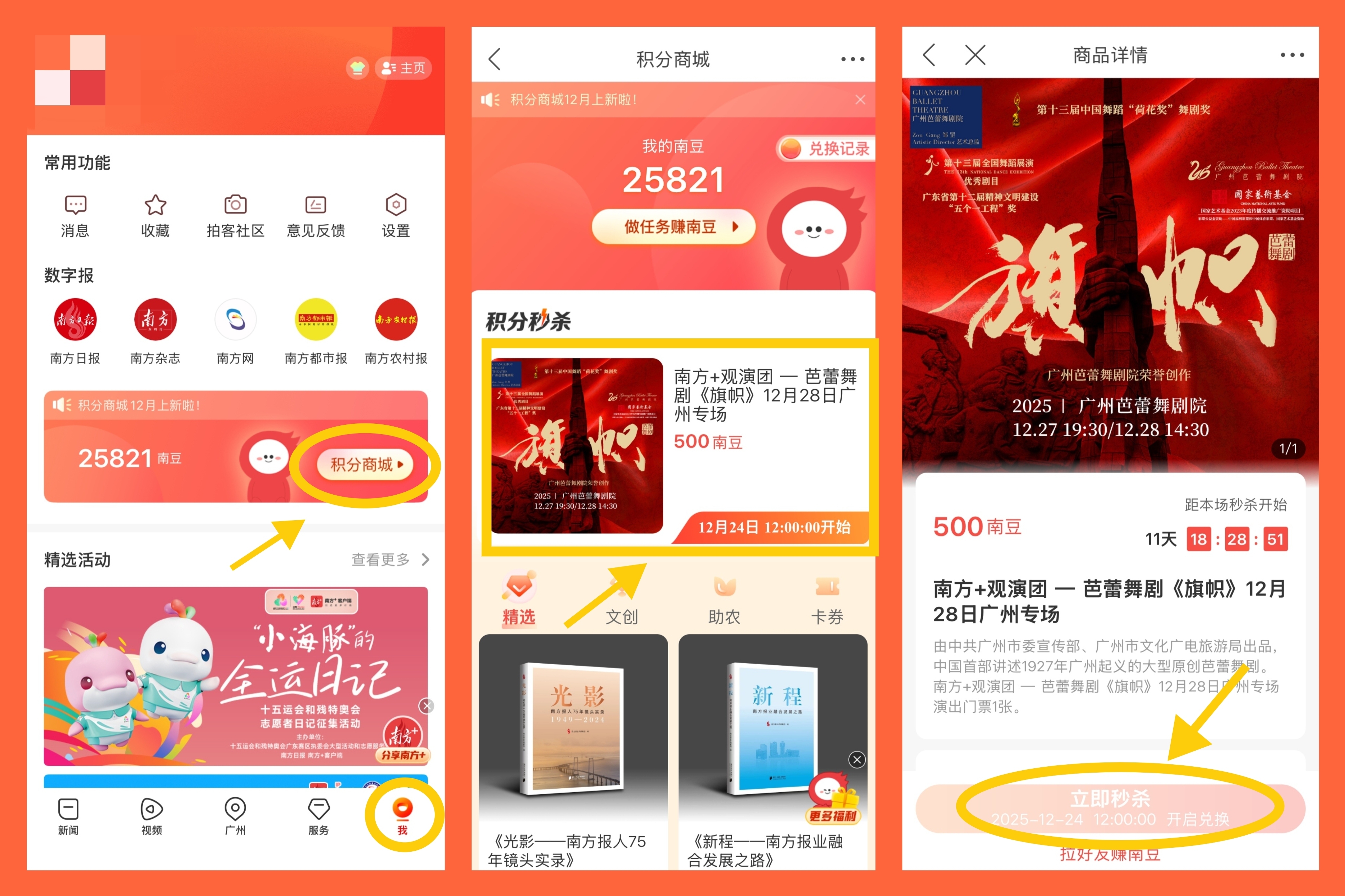 秒杀攻略:打开南方+客户端,点击“我”→“积分商城”,点击积分秒杀商品参与秒杀活动,先到先得。进入积分商城>>
