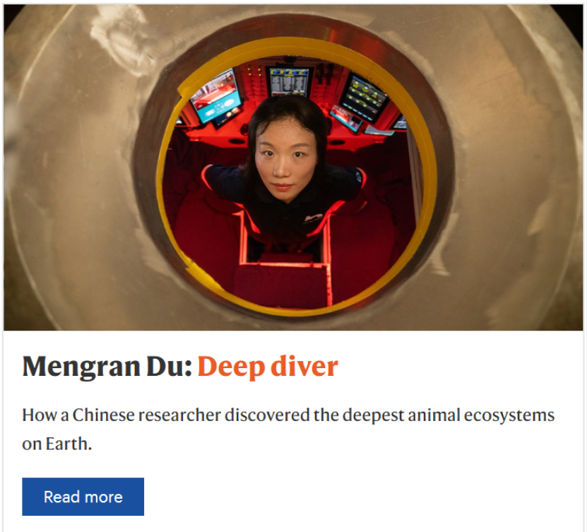 杜梦然被《自然》称为“深潜者”,榜单强调她在海平面9000米以下发现了地球上最深的动物生态系统,在海洋最底层“见证科学界前所未有的景象”。祝贺>>