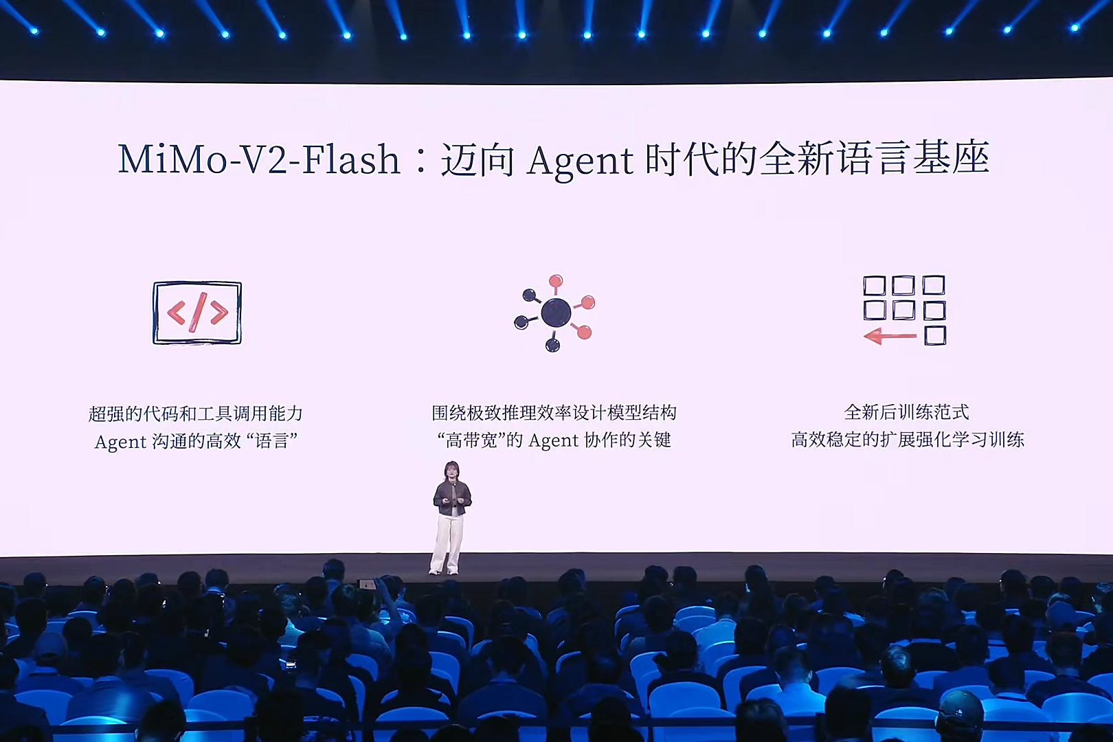 在分享环节,罗福莉主要针对小米MiMo-V2-Flash基座大模型的特点进行了阐述。
