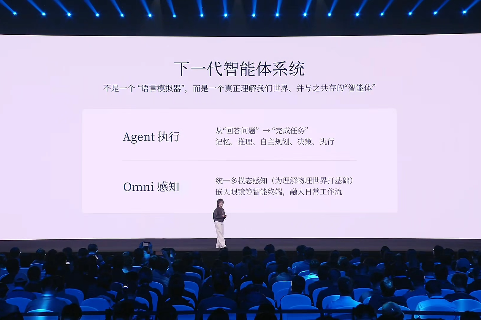 这种智能体需要具备两个潜能,一是“Agent执行”,从“回答问题”到“完成任务”,具有记忆、推理、自主策划、决策、执行等能力,二是具备“Omni感知能力”,要有统一多模态感知,为理解物理世界打基础,有了这一基础后,可以无缝嵌入眼镜等智能终端,融入日常工作流。