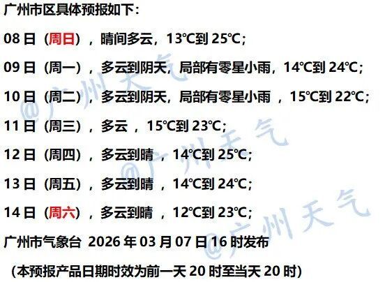 广州市气象台预计,3月8日广州晴朗持续,昼夜温差较大。3月9日—10日受高空波动和弱冷空气补充影响,云量增加,局部或有零星小雨,最高气温略有下降。