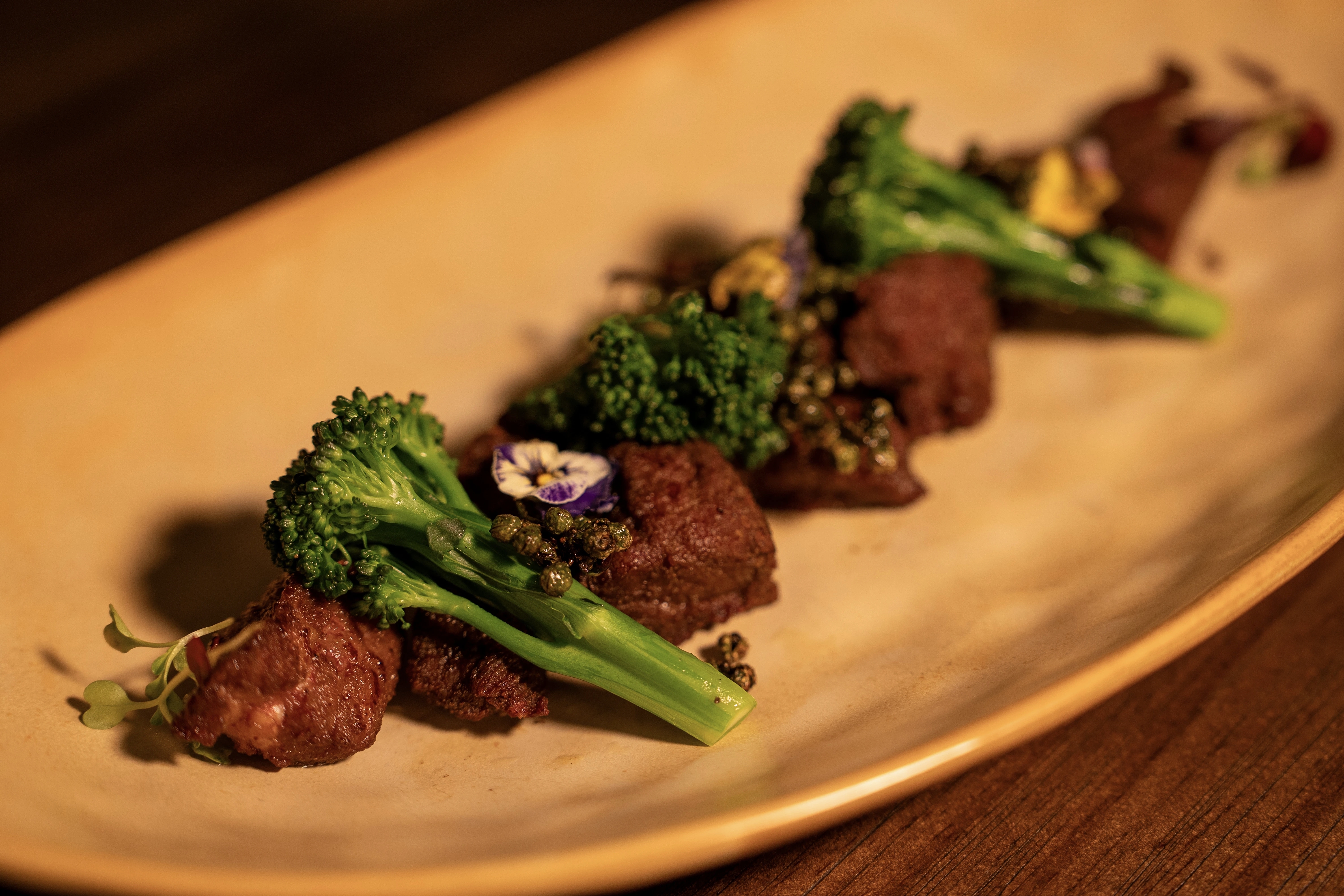 堪称颜值与口感双绝,上层玫瑰盐烧比目鱼肉质细嫩如脂,中层脆香薯饼外酥内绵,搭配绵滑清甜、奶香温润的甘笋奶油南瓜汁,一菜三层口感,嫩、酥、滑层层递进,高级质感拉满。