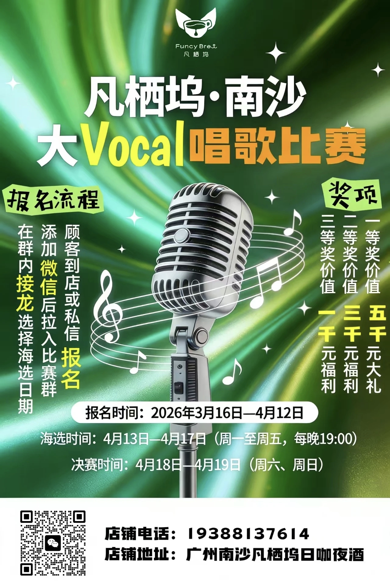 在森系livehouse里放声歌唱还有千元福利等你拿!到店私信/扫码进群即可报名用歌声承包这个春天的舞台✨下一个南沙歌王就是你!