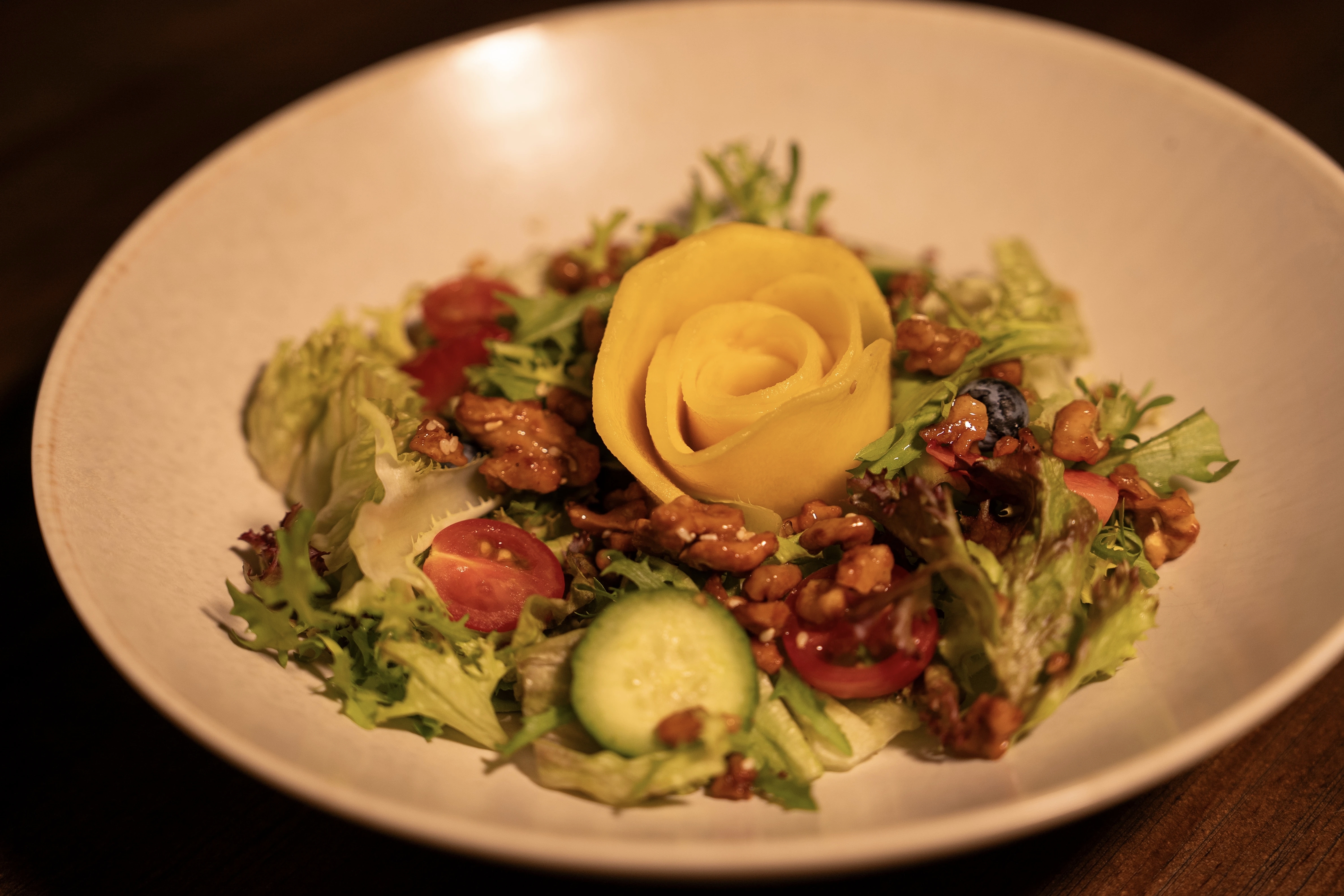 新鲜脆嫩的时蔬打底,搭配清甜多汁的芒果与香脆的琥珀核桃,果香清新、坚果香浓,口感层次丰富。