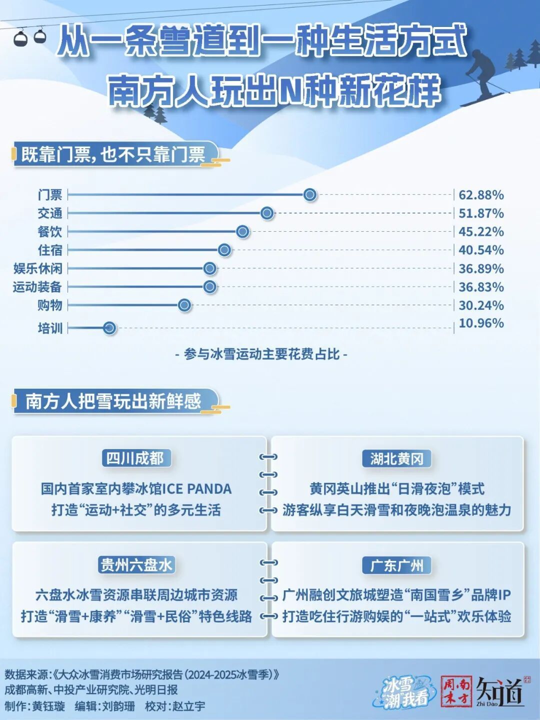冰雪消费的带动效应,远不止一张门票。数据显示,参与冰雪运动的主要花费除门票外,还涵盖交通、餐饮、住宿、娱乐、装备、购物等多个环节,形成一个庞大的消费生态。