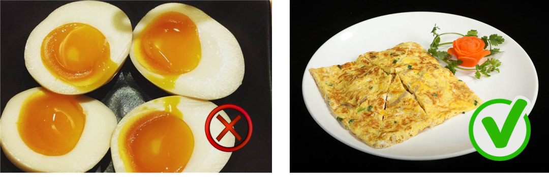 ② 鸡蛋:使用鸡蛋前,应清洗干净蛋的外壳,必要时消毒外壳。烹饪时必须确保烧熟煮透。不得提供以生鸡蛋为原料且不经彻底加热处理的三文治、沙拉等食品。