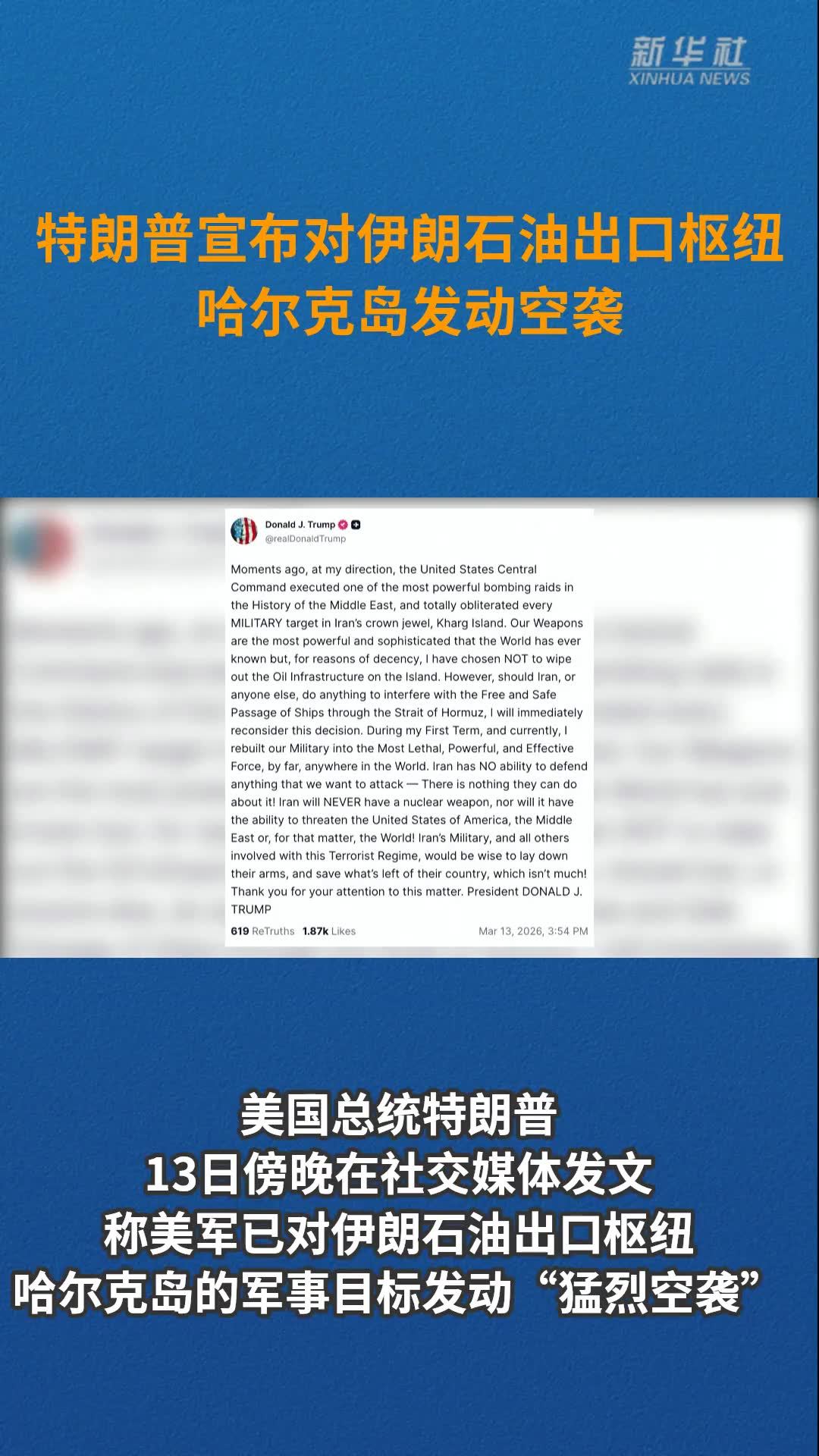 特朗普宣布对伊朗石油出口枢纽哈尔克岛发动空袭
