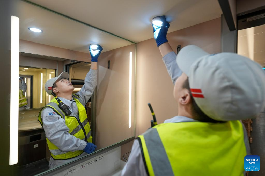 E Ming replaces a light bulb on the train at a train depot in Yuci, north China's Shanxi Province, Feb. 14, 2026. Railway staff members have stepped up the maintenance of high-speed trains to ensure traffic safety during the Spring Festival travel rush.