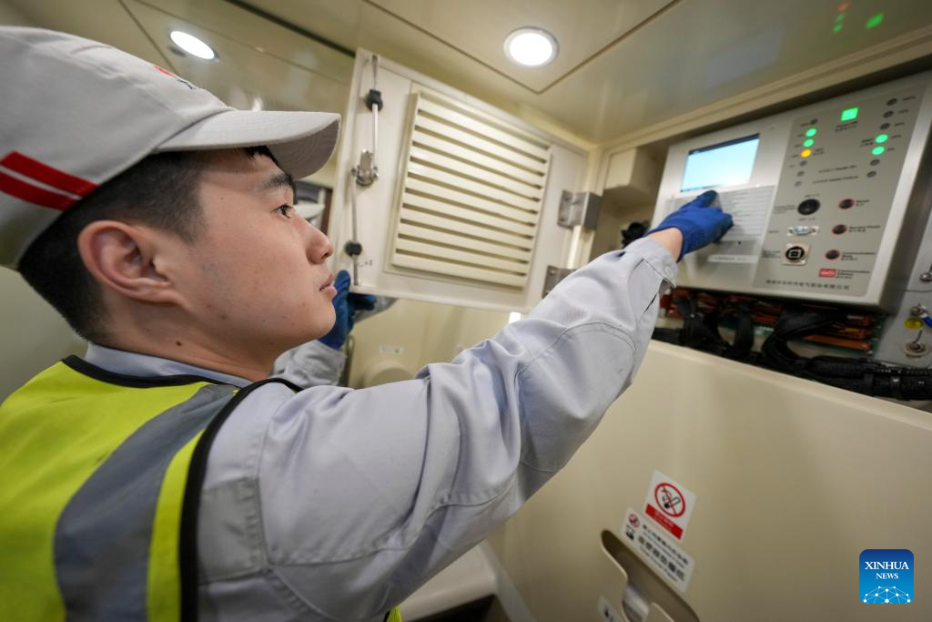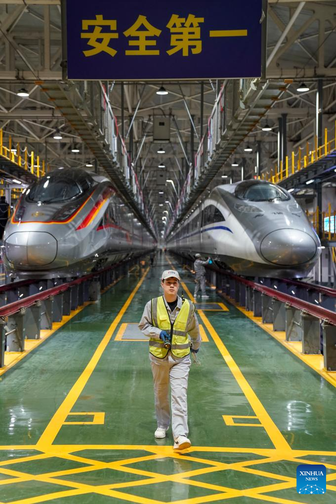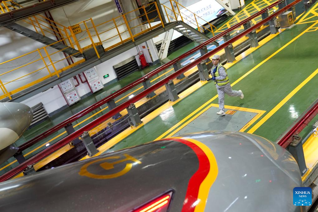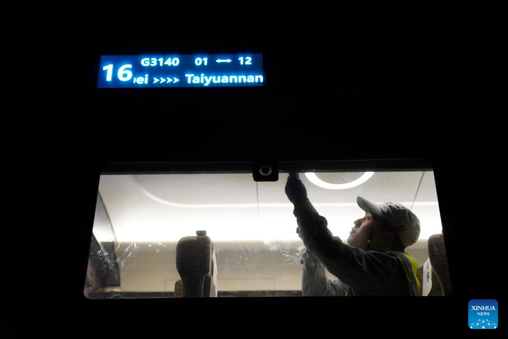 E Ming inspects on the train at a train depot in Yuci, north China's Shanxi Province, Feb. 13, 2026. Railway staff members have stepped up the maintenance of high-speed trains to ensure traffic safety during the Spring Festival travel rush.