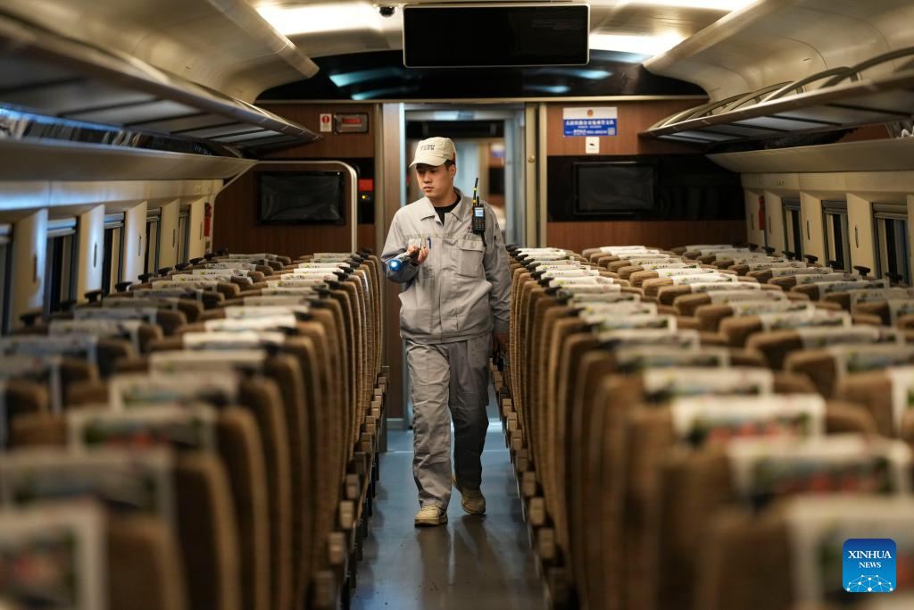 E Ming is a service mechanic, responsible for inspecting and repairing onboard equipment such as seats, restrooms, and electric water boilers. During the Spring Festival travel rush, these facilities experience high usage and are prone to malfunctions. E Ming's team must work against the clock during the train's brief maintenance window at night to resolve equipment issues. (Xinhua/Yang Chenguang)