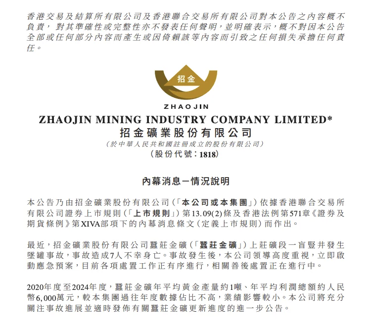 关于此次事故对企业经营的影响,招金矿业披露,2020年度至2024年度,蚕庄金矿年平均黄金产量约1吨、年平均利润总额约6000万元,相关指标在集团整体业绩中占比不高,预计对公司整体业绩影响较小。公司同时承诺,将持续关注事故进展,及时发布后续相关公告。