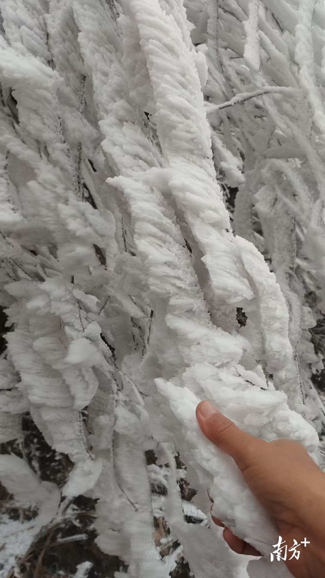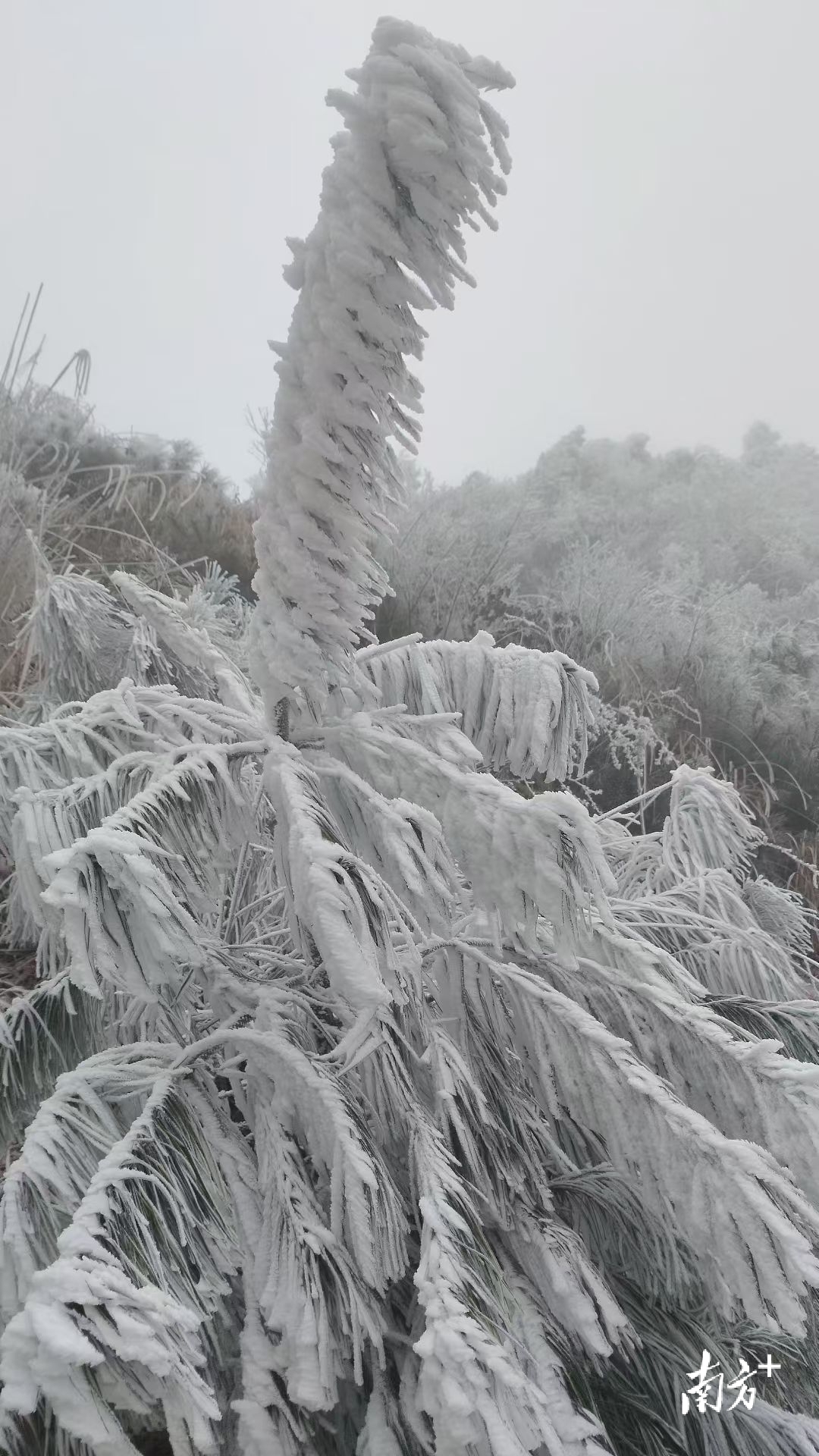 近看似玉树琼花,远看如千里冰封——21日,连州市星子镇黄沙塘村出现冰挂雾凇,一派北国风光。