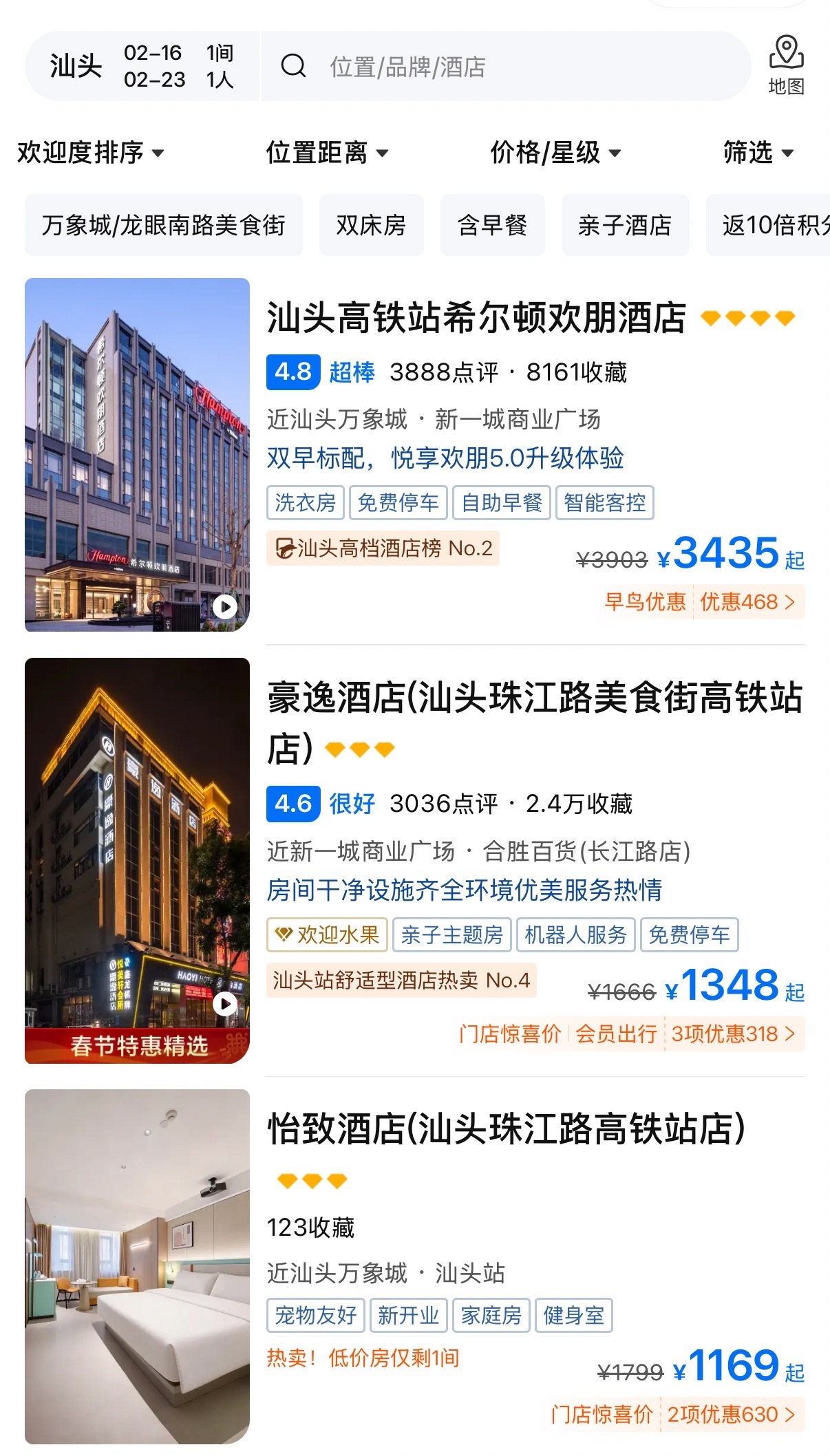 春节前后,汕头酒店价格呈现出大幅波动的态势。平日期间,汕头万象城华山南路亚朵酒店深睡尊享大床房价格稳定在720元左右,小公园、海滨长廊等核心区域的经济型连锁酒店,基础房型价格多在180元至260元之间。然而,春节假期高峰时段,该亚朵酒店房型报价飙升至每晚4221元,门市价最高达4599元,涨幅接近5倍;小公园附近一经济型酒店,平日不到200元的房型涨至每晚1044元,部分景区周边酒店价格更是突破每晚6000元的高价。