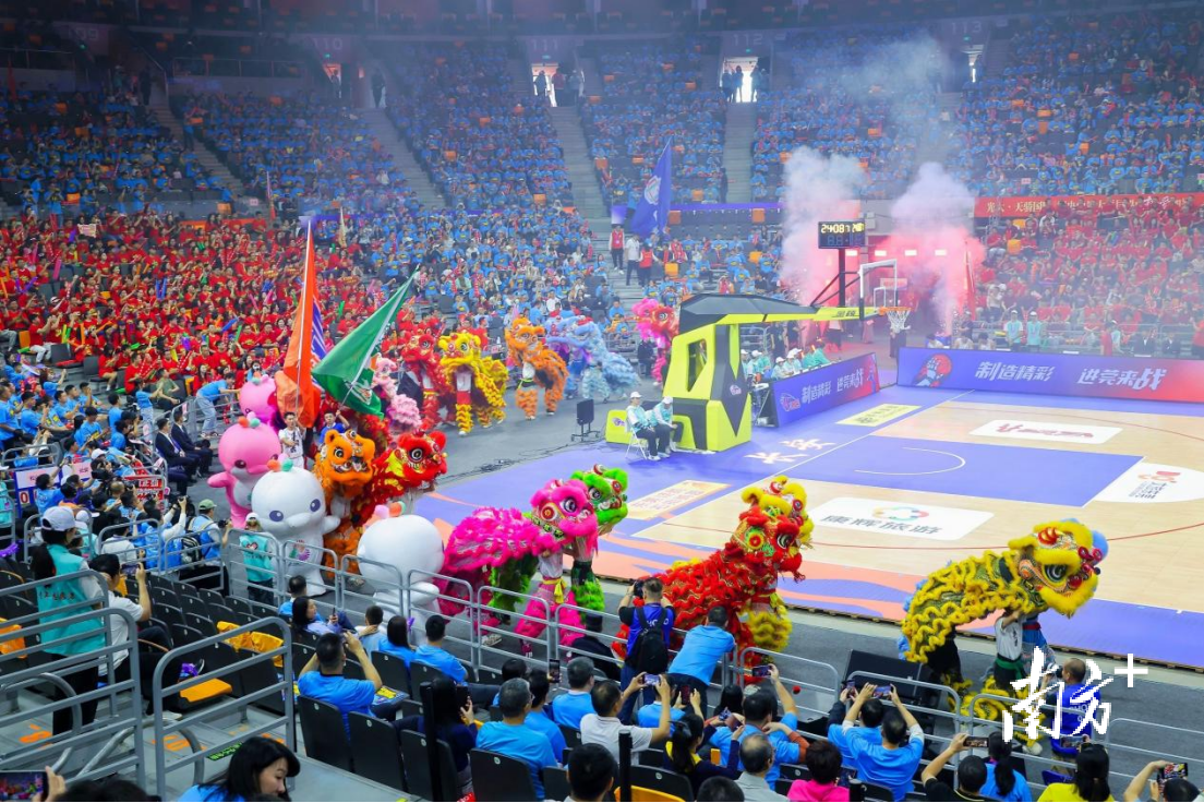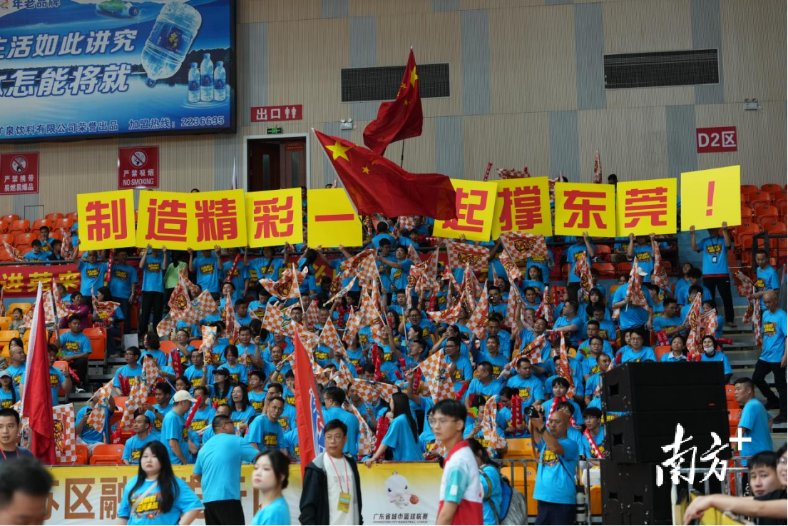 看台两侧,松山湖队与长安队助威团成员身着统一队服,此起彼伏地喊着口号。一面面旗帜被用力挥舞,鼓点声、呐喊声、掌声交织在一起,像两股巨浪在球馆上空碰撞。