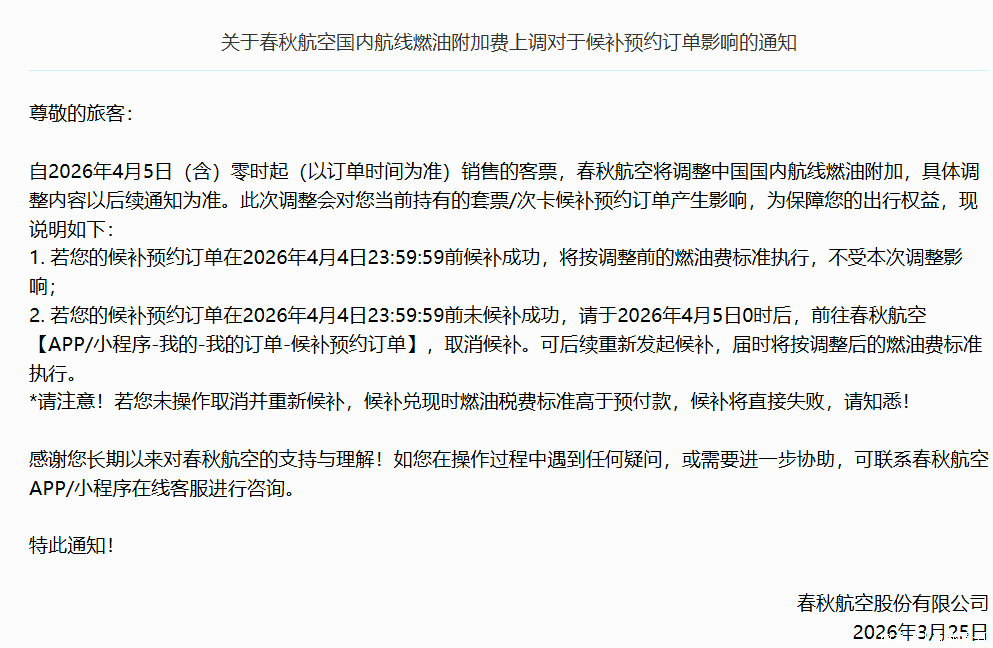 3月25日,春秋航空率先发布通知,自2026年4月5日(含)零时起,按订单时间计算,上调国内航线燃油附加费,具体调整方案以后续通知为准。