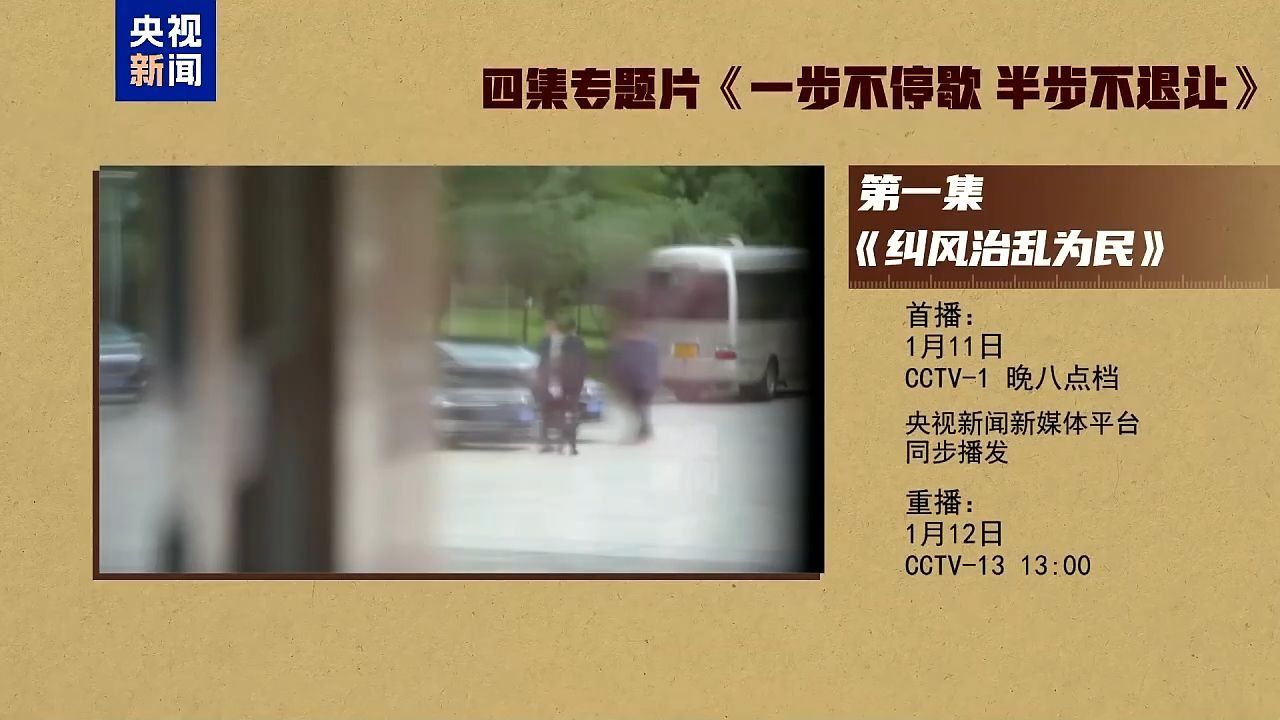 电视专题片《一步不停歇 半步不退让》第一集《纠风治乱为民》,讲述纪检监察机关不断加大风腐同查同治力度,锲而不舍落实中央八项规定精神,严肃查处违规吃喝背后的团团伙伙、请托办事和利益输送,集中整治群众身边不正之风和腐败问题,让群众真切感到正风反腐加力度、清风正气在身边。总台央视综合频道1月11日晚8点档播出,央视新闻新媒体平台同步播发。