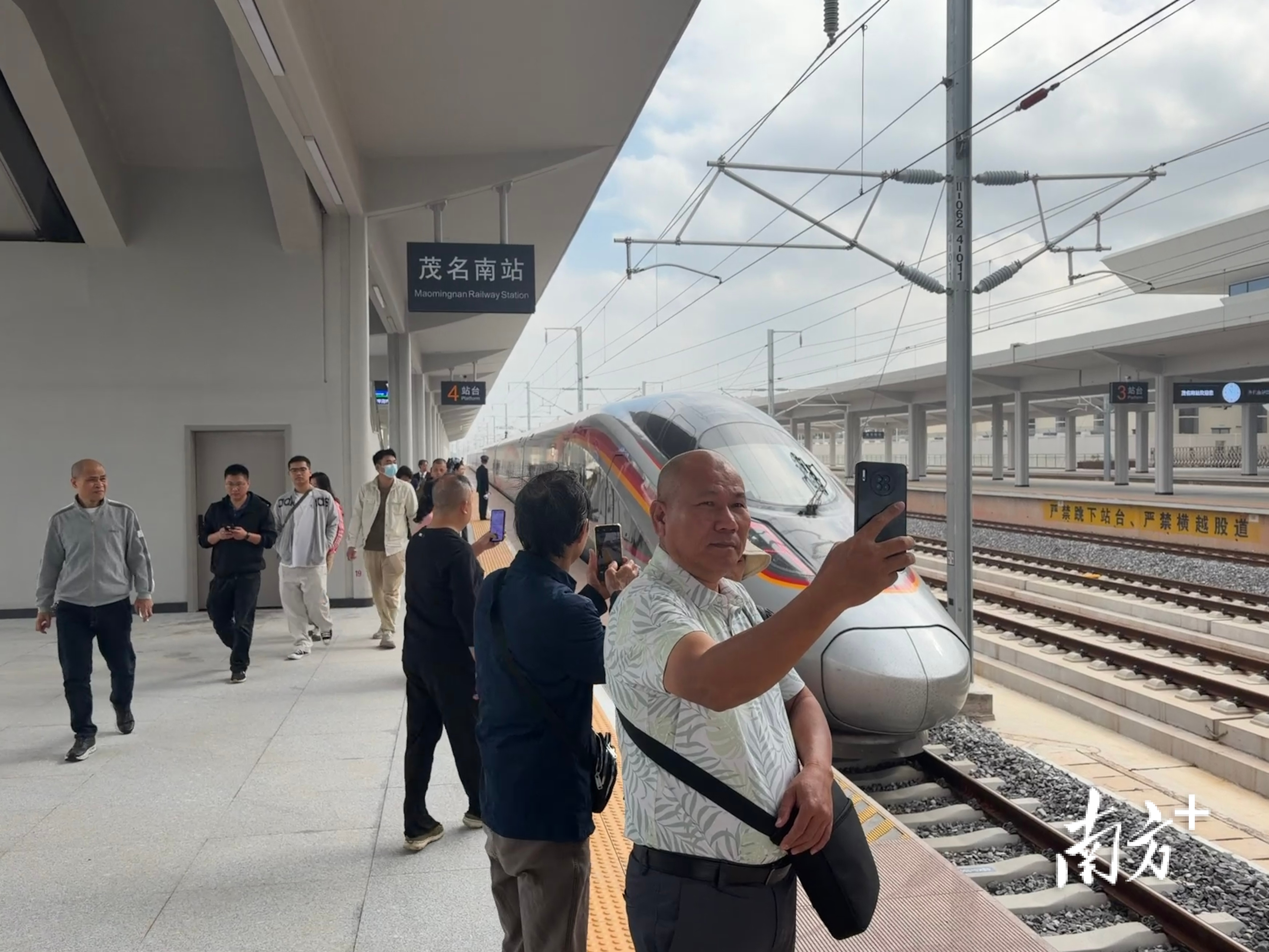 列车驶进茂名南站,乘客在站台与复兴号列车合照。邹祥亮 摄