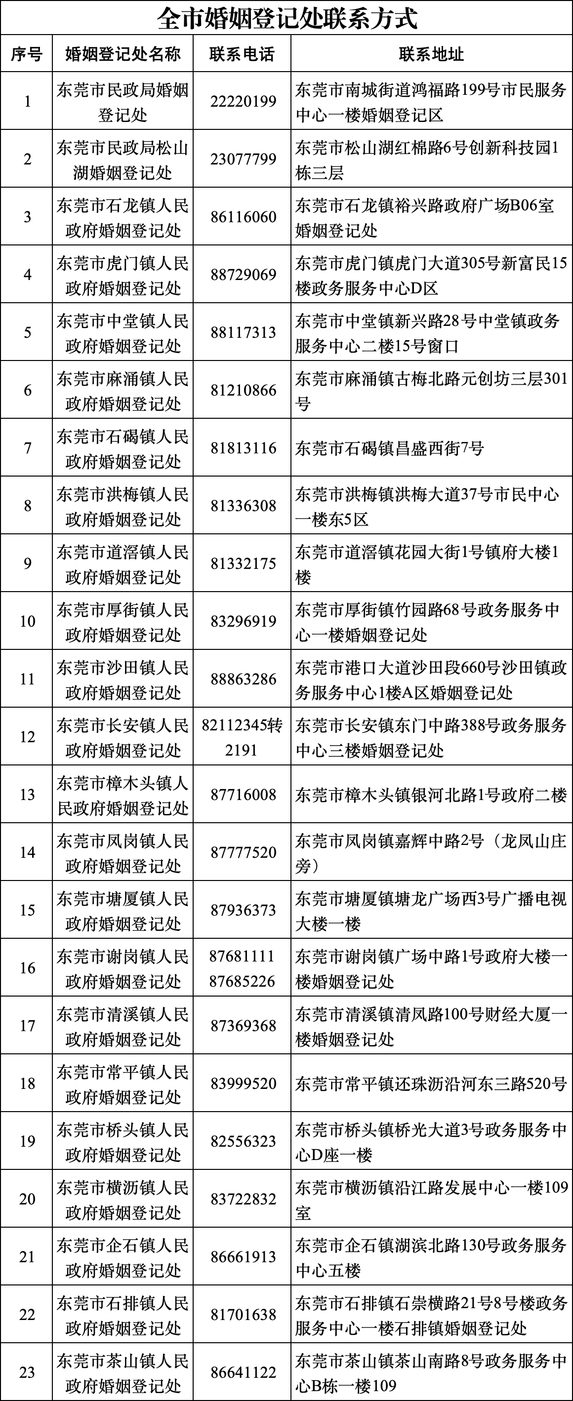 东莞市各婚姻登记处联系方式