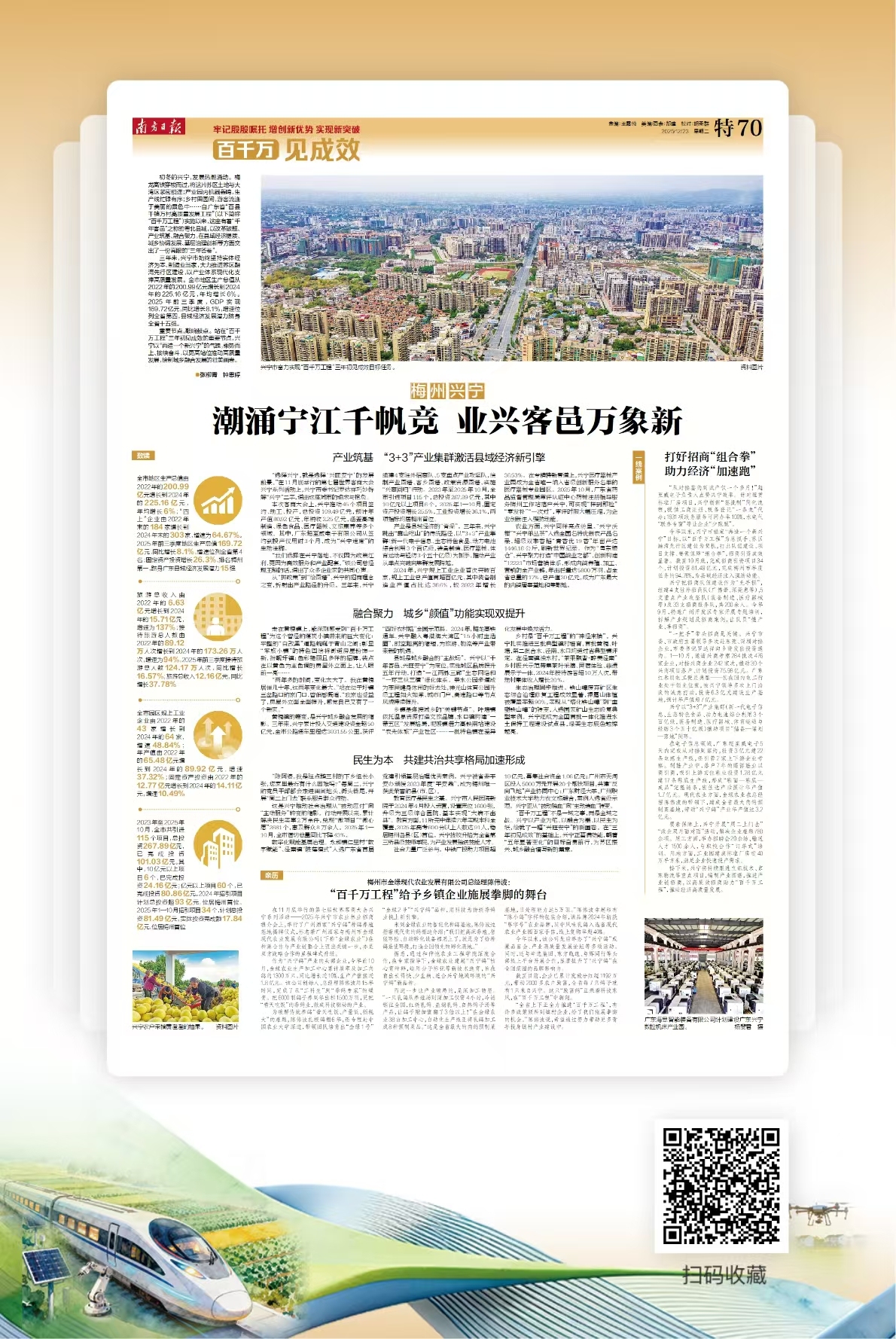 初冬的兴宁,发展热潮涌动。梅龙高铁穿梭而过,将这片苏区土地与大湾区紧密相连;产业园内机器轰鸣,生产线忙碌有序;乡村田园间,游客流连于美丽的景色中……自广东省“百县千镇万村高质量发展工程”(以下简称“百千万工程”)实施以来,这座有着“千年客邑”之称的粤北县城,以改革破题、产业筑基、融合聚力,在县域经济提质、城乡协调发展、基层治理创新等方面交出了一份亮眼的“三年答卷”。