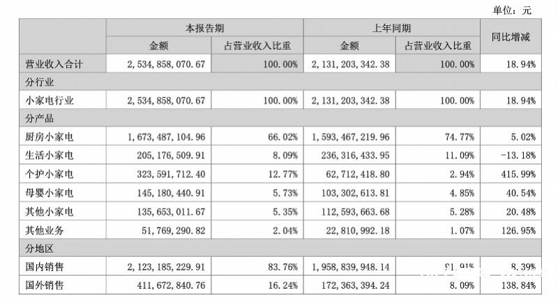 值得关注的是,财报显示小熊电器的个护小家电业务同比增长415.99%,为各个业务板块中增幅最大,本报告期营收为3.2亿元,占总营业收入比重也从去年同期的的2.94%,上涨至今年12.77%,为各业务板块中的第二大,仅次于小熊电器的传统厨房小家电业务。