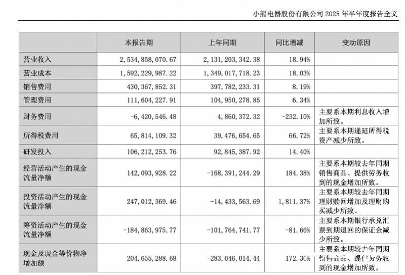 8月29日,小熊电器发布2025年半年度报告,2025年上半年实现营业收入25.35亿元,同比增长18.94%;实现净利润2.05亿元,同比增长27.32%;基本每股收益1.3047元;加权平均净资产收益率ROE为7.00%。