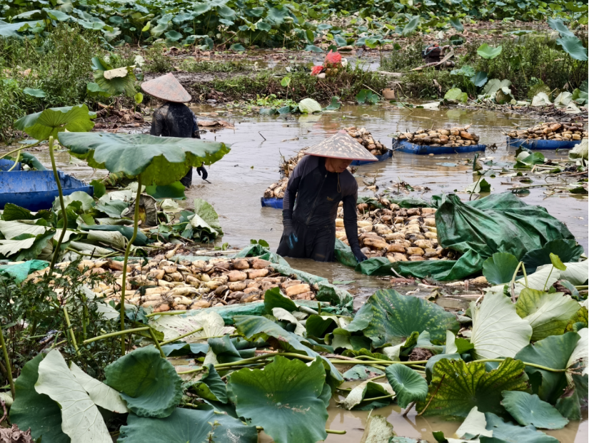 塘里,白白胖胖的莲藕被一筐筐捞出、装车,新鲜的藕香伴着村民的笑意,成了夏日里最动人的“丰收图景”。