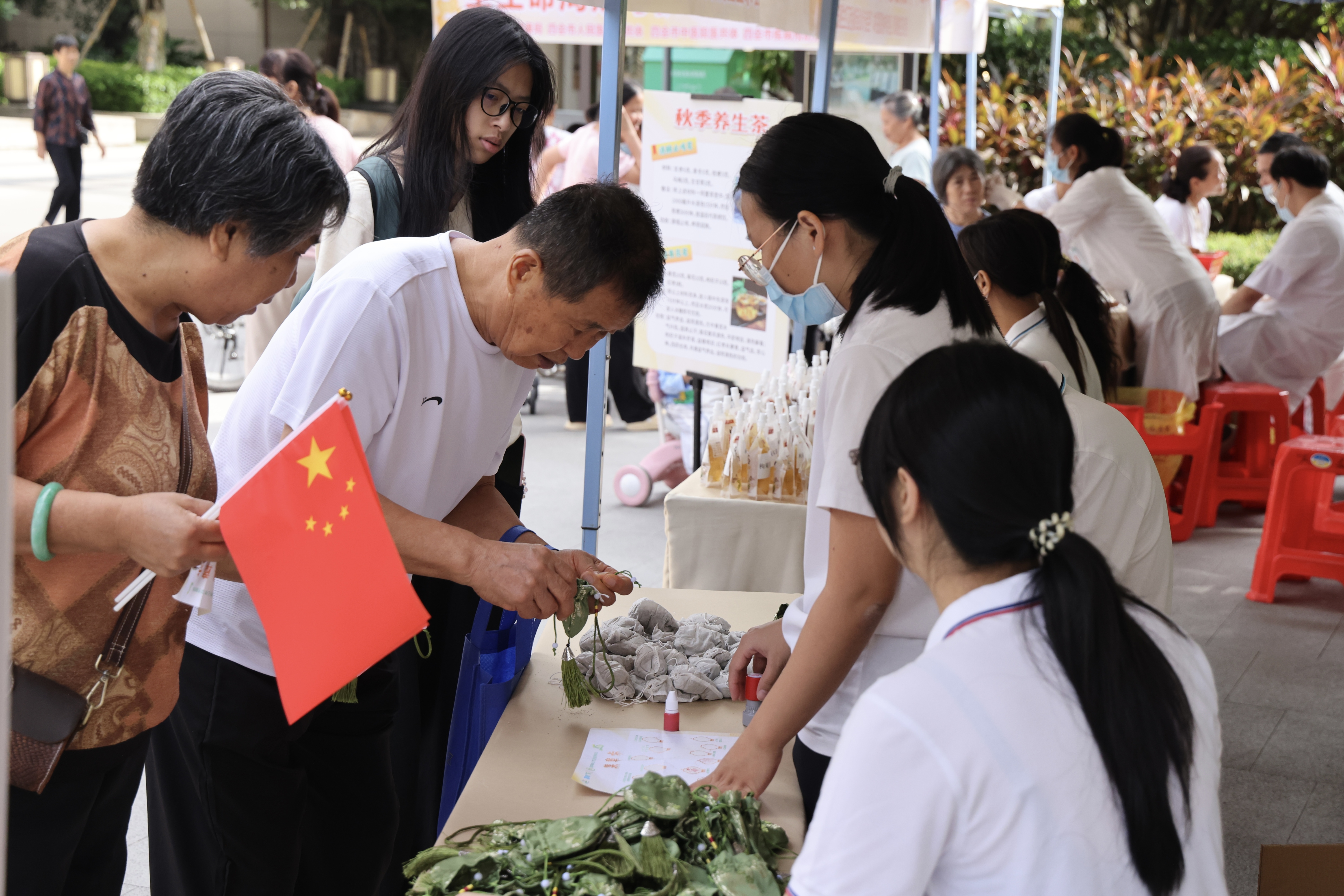 “这个艾草香囊闻着真舒服,秋天蚊子多,挂在家里正好!”在中医体验区,志愿者手把手教居民制作驱蚊艾草香囊,穿绳、装料、封口……大家兴致勃勃,现场气氛轻松愉快。一旁的养生茶饮台前,清肺止咳饮、杞菊黄芪饮两款秋季特色茶饮备受欢迎,医护人员一边递茶,一边讲解“秋季润燥”的中医养生知识。