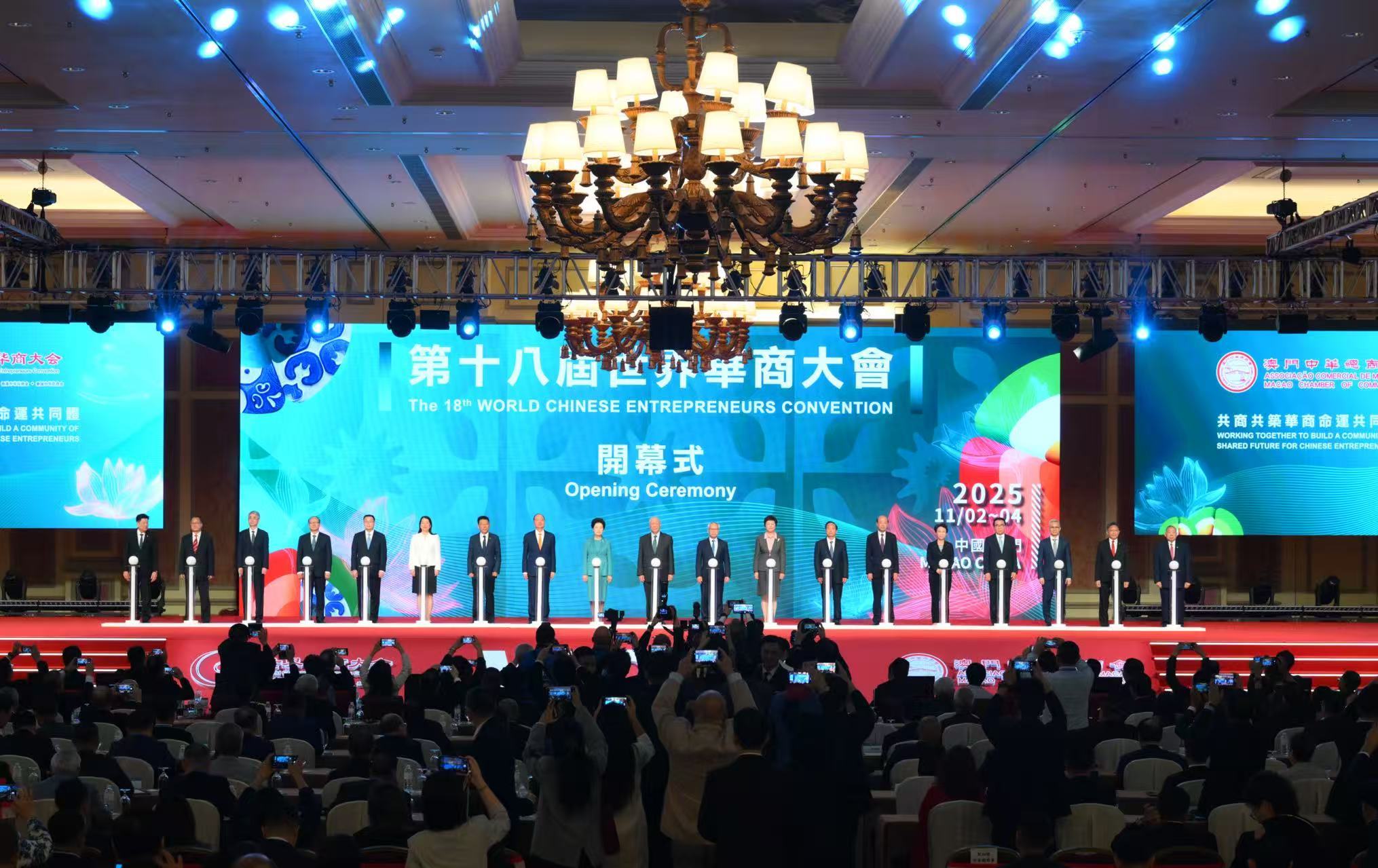 开幕式及主旨论坛在澳门威尼斯人度假村酒店三楼宴会厅举行。全国政协副主席何厚铧、咸辉,中央和国家机关有关部门、有关团体负责同志,澳门特别行政区行政长官岑浩辉及相关政府官员,中央驻澳机构主要负责同志,以及来自全球50多个国家和地区的华商代表、专家学者、政企界人士共4000余人参会。
