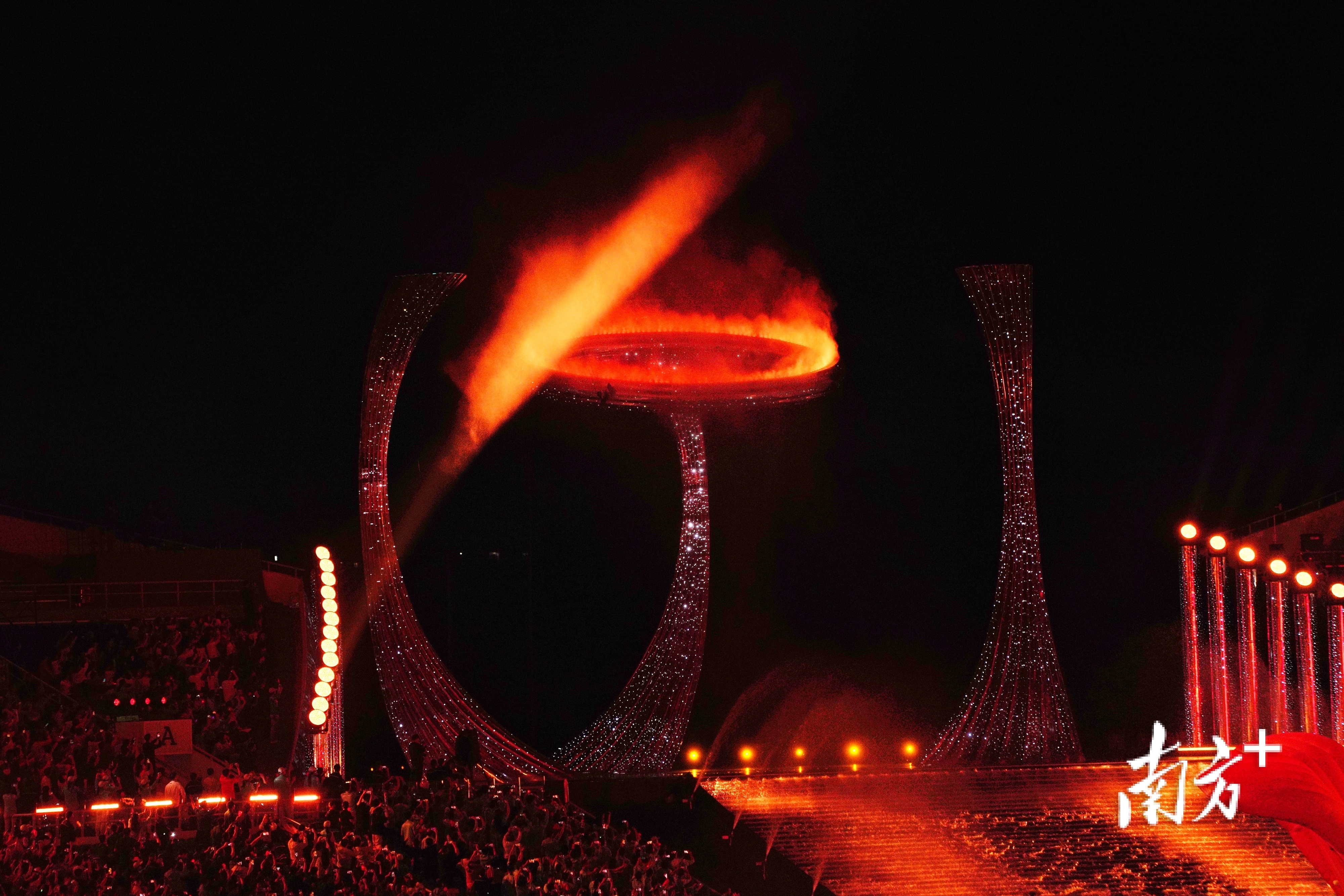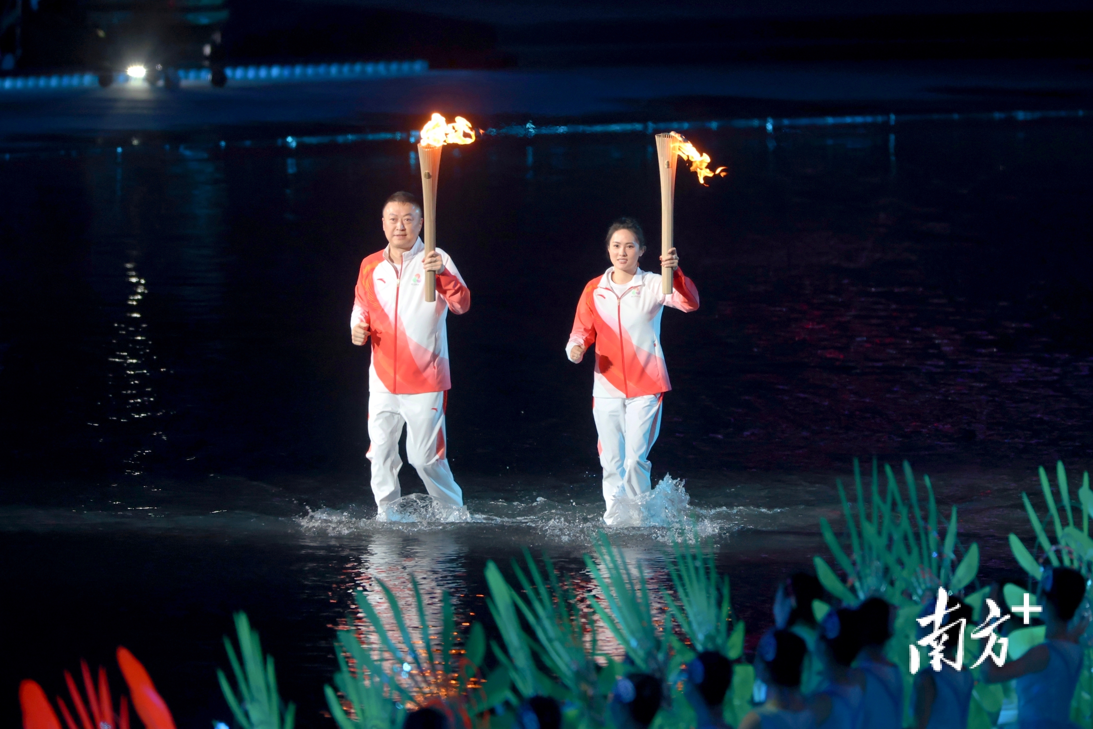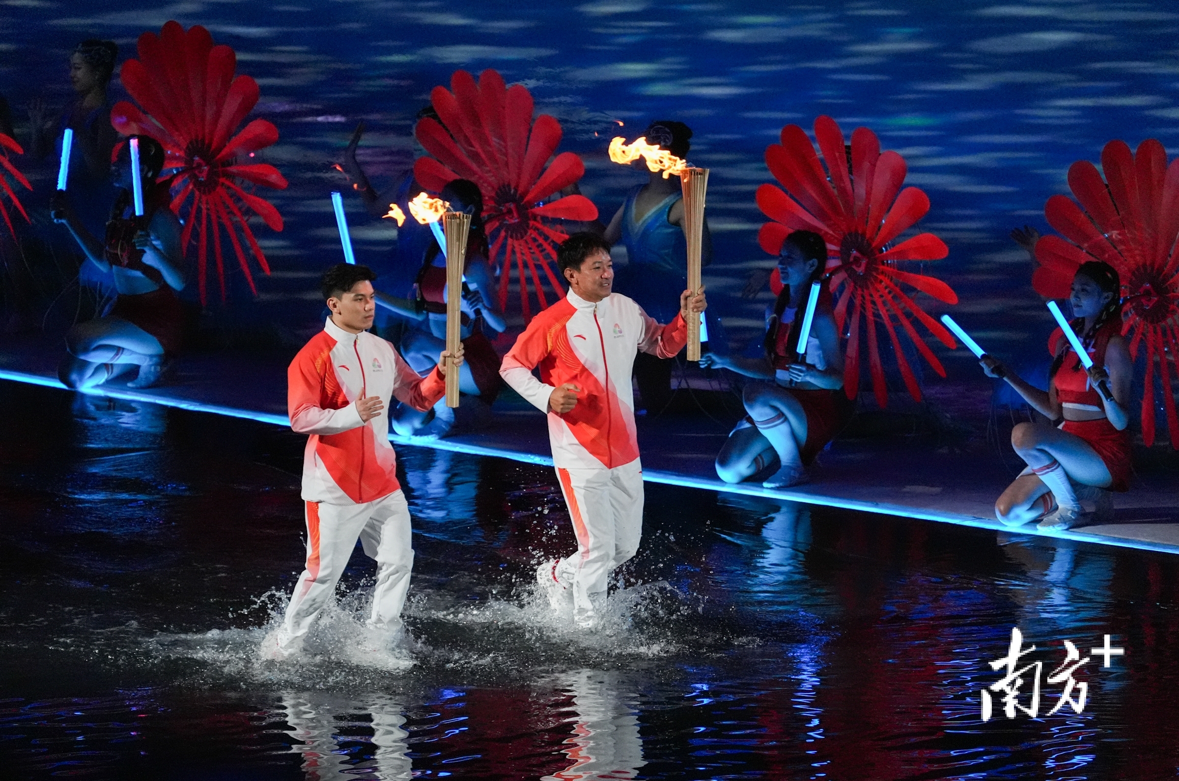 开幕式上,最后一棒火炬是由广东、香港、澳门三地的火炬手苏炳添、张家朗、李祎共同点燃。