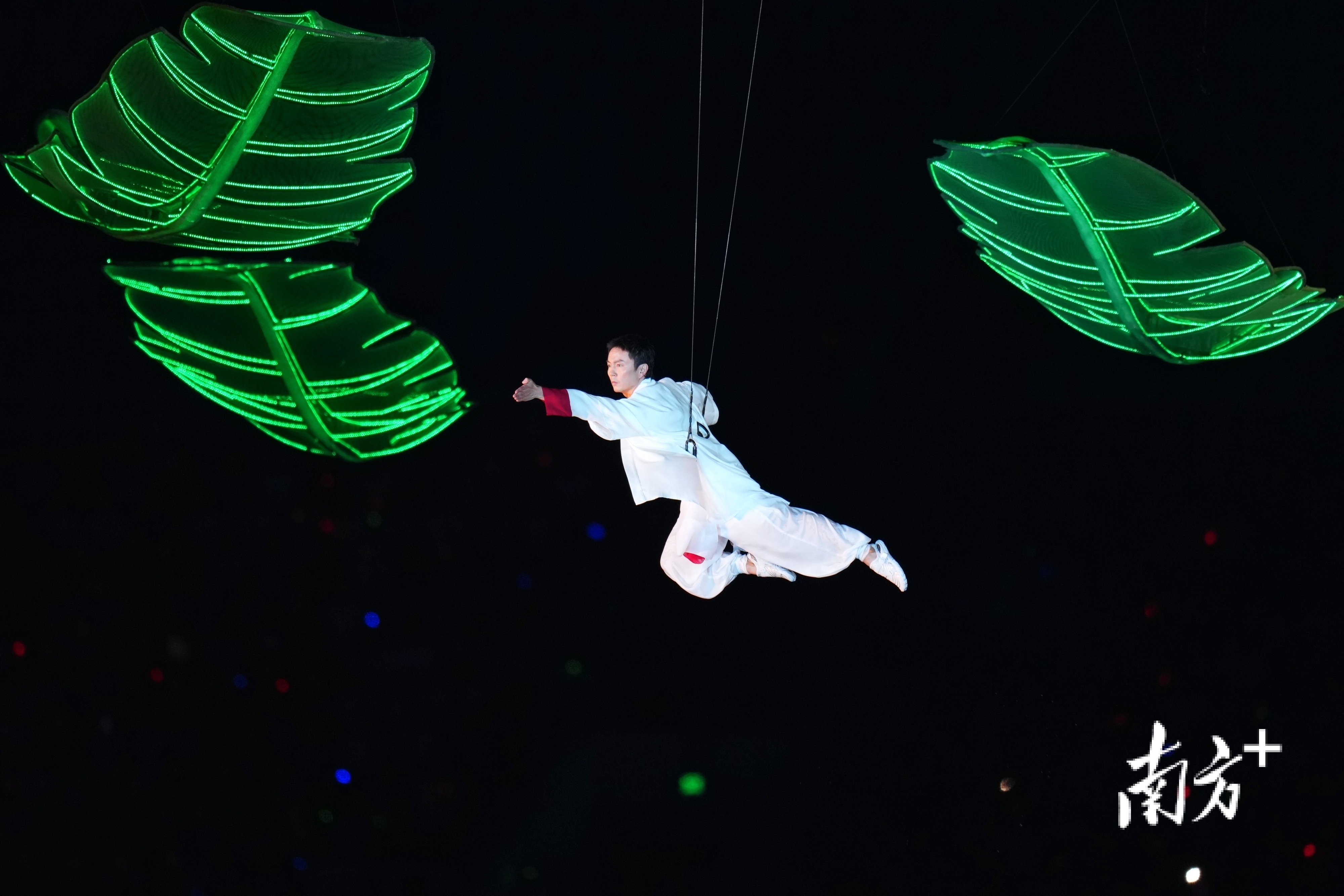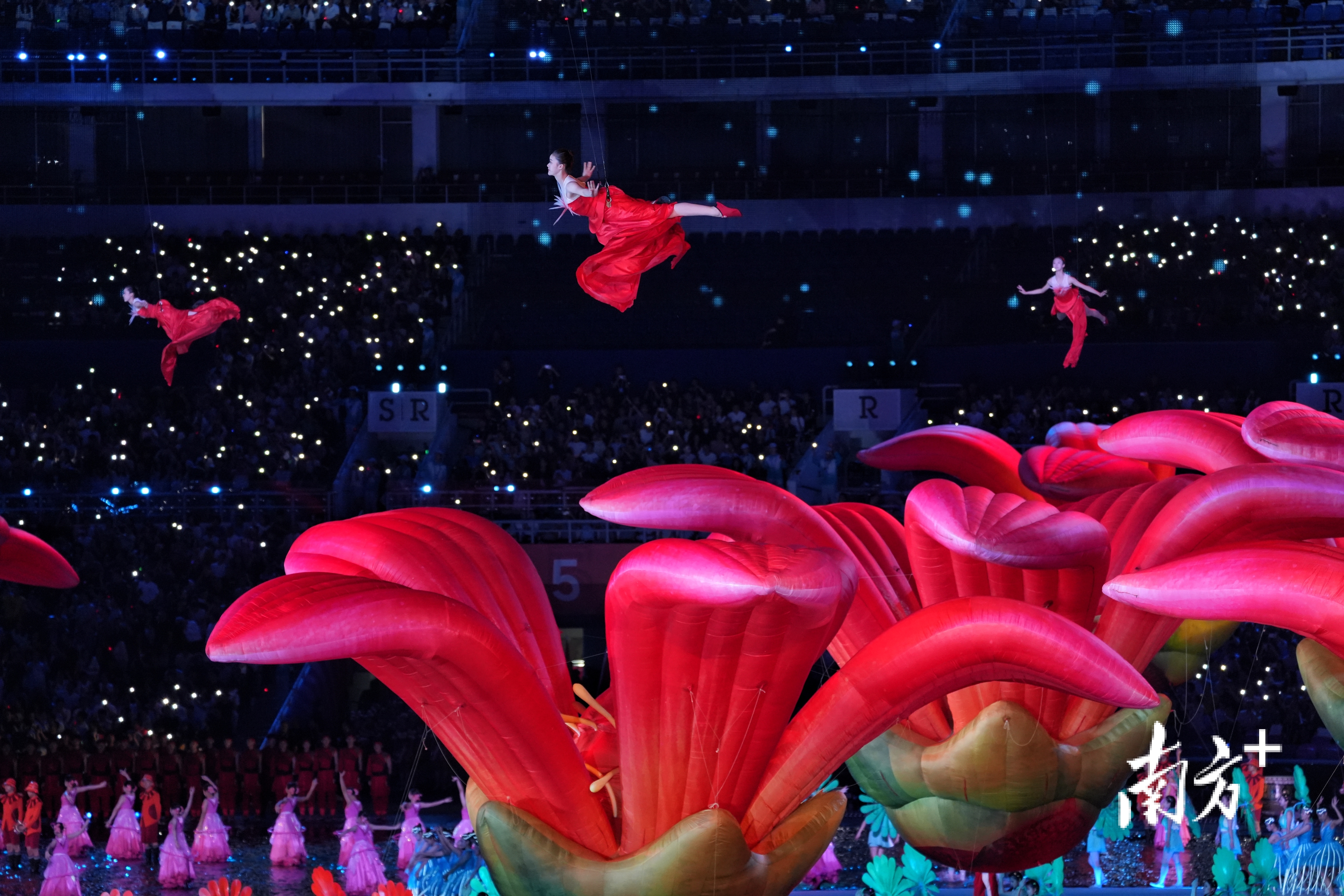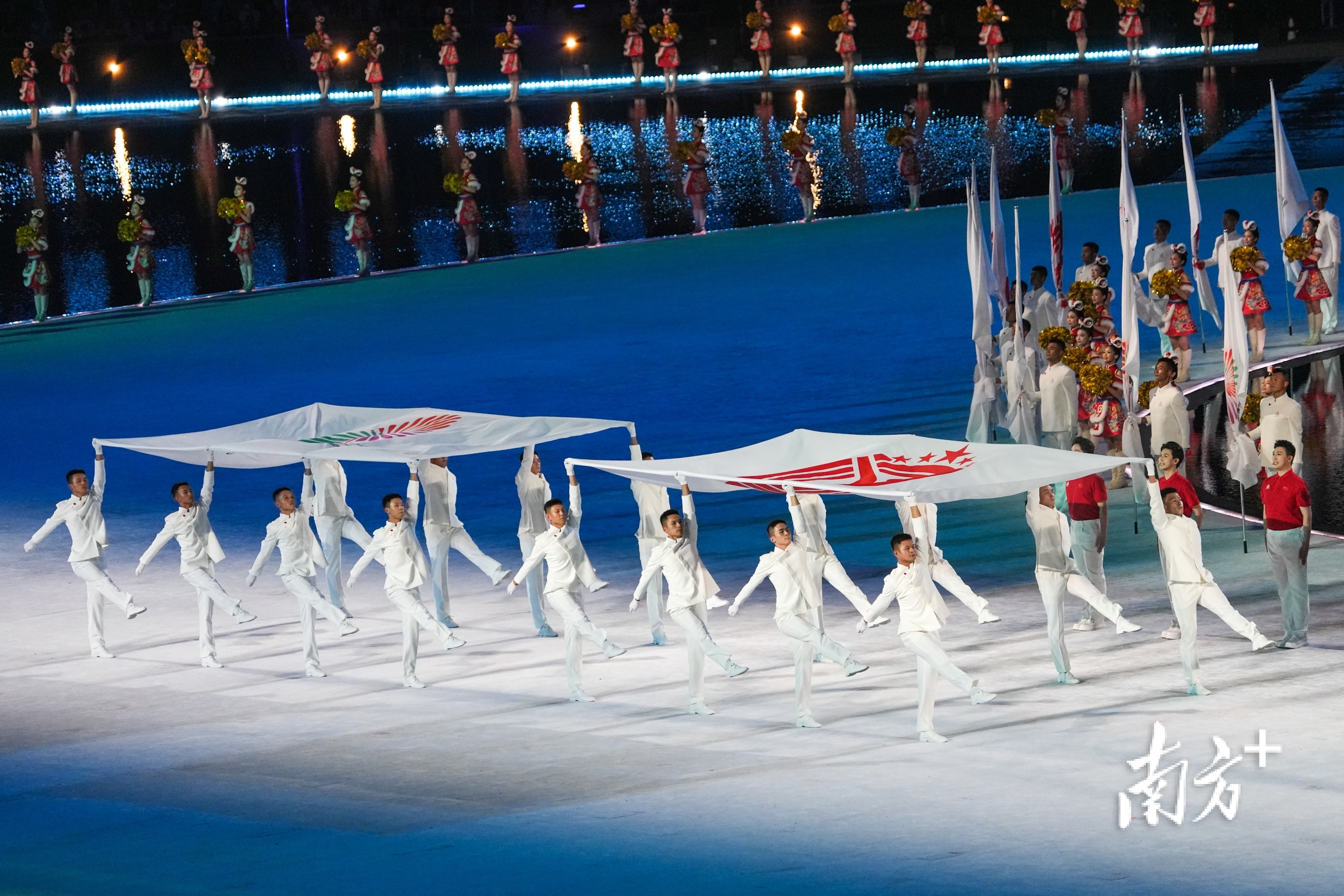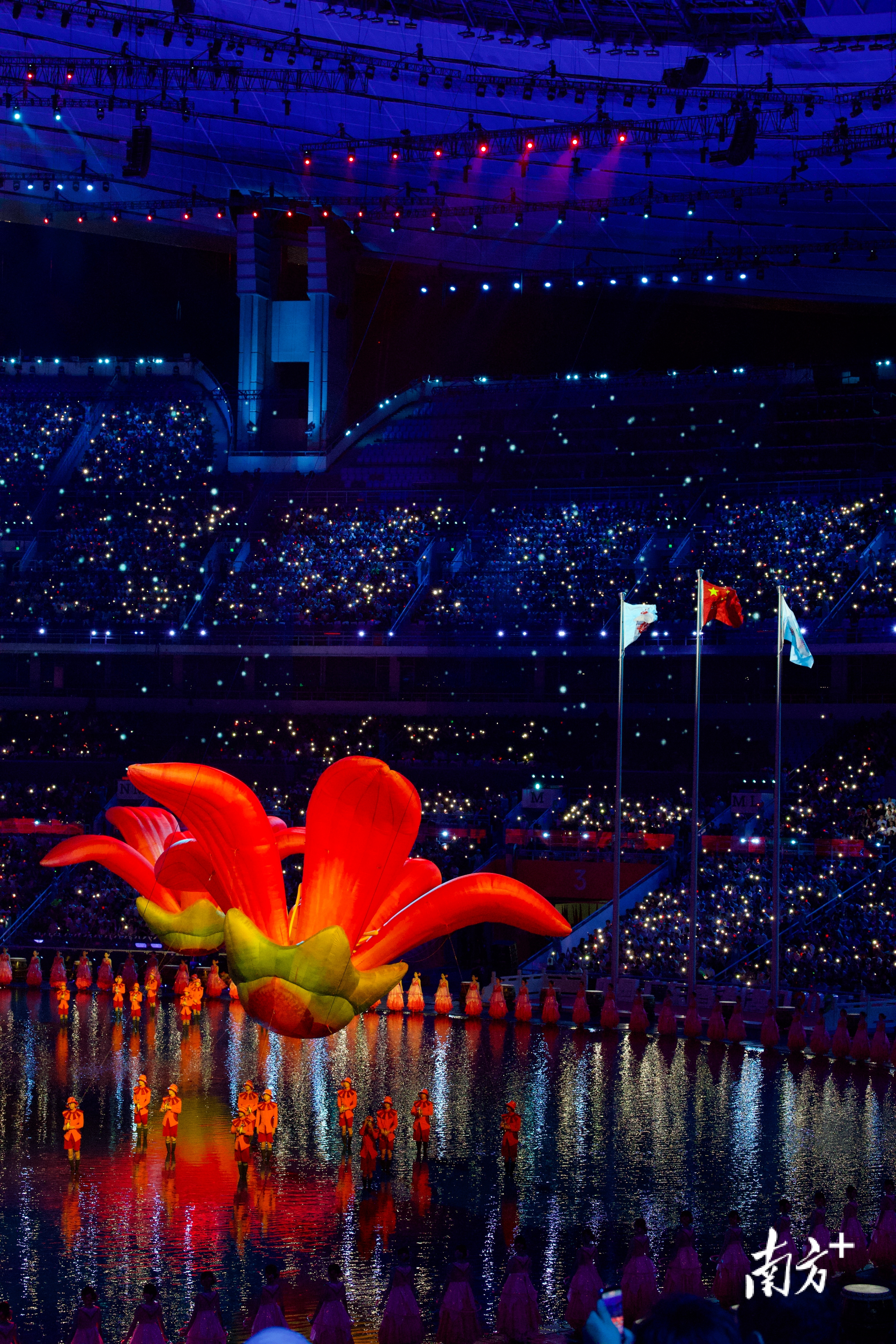开幕式上,最后一棒火炬是由广东、香港、澳门三地的火炬手苏炳添、张家朗、李祎共同点燃。