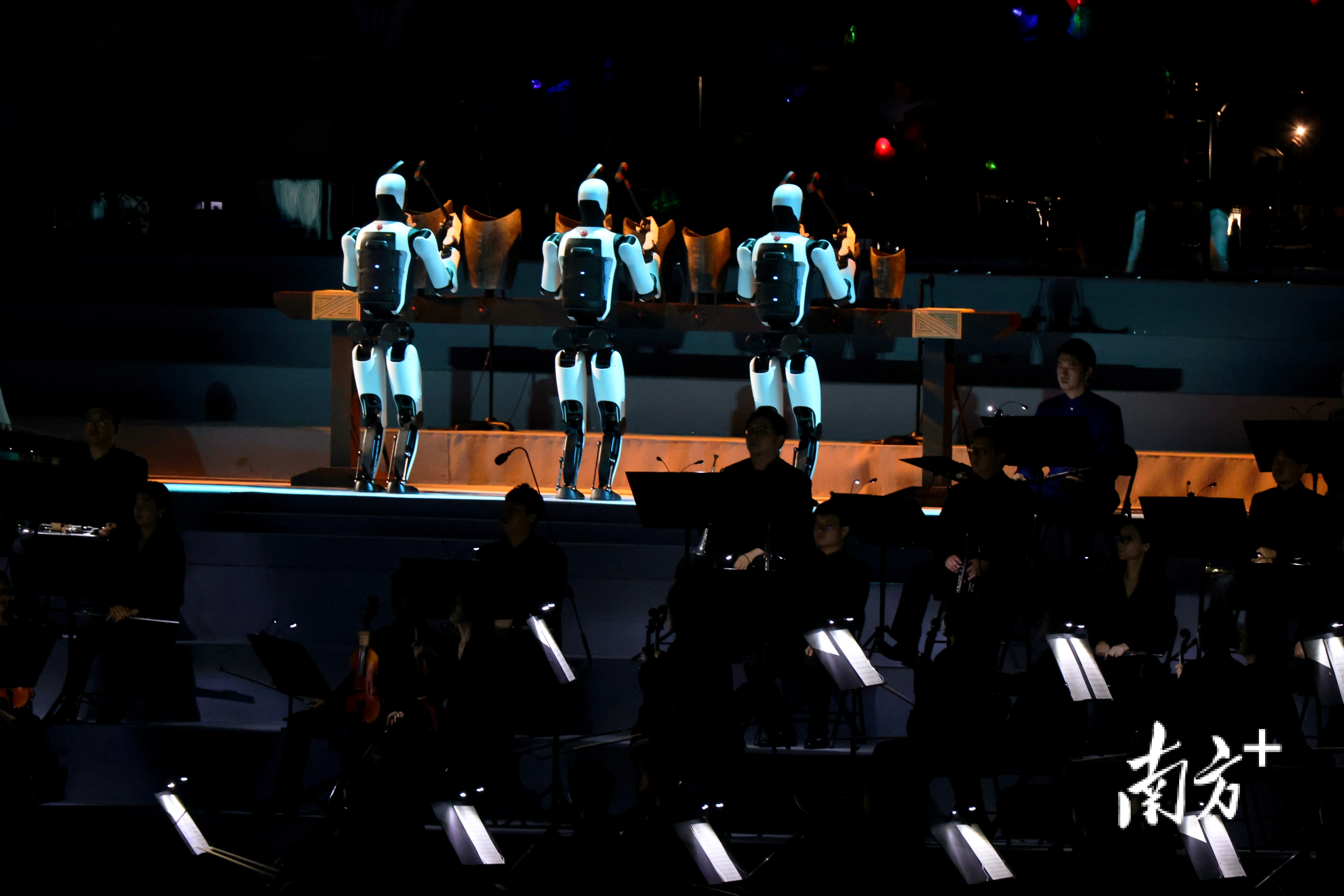机器人敲击文物青铜句鑃,演奏开场曲《彩云追月》。