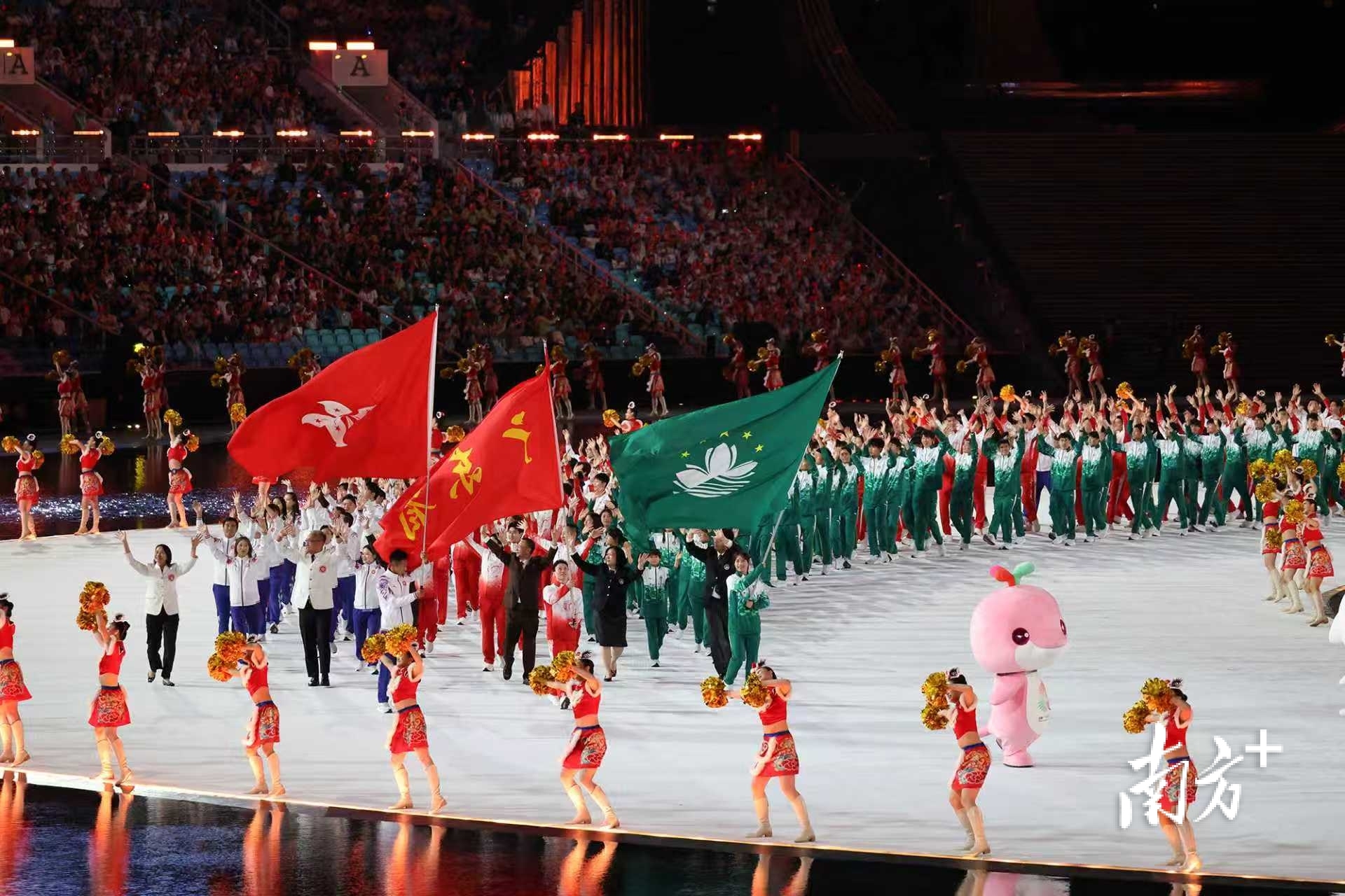 广东省体育代表团、香港特别行政区体育代表团、澳门特别行政区体育代表团在入场仪式上共同入场。