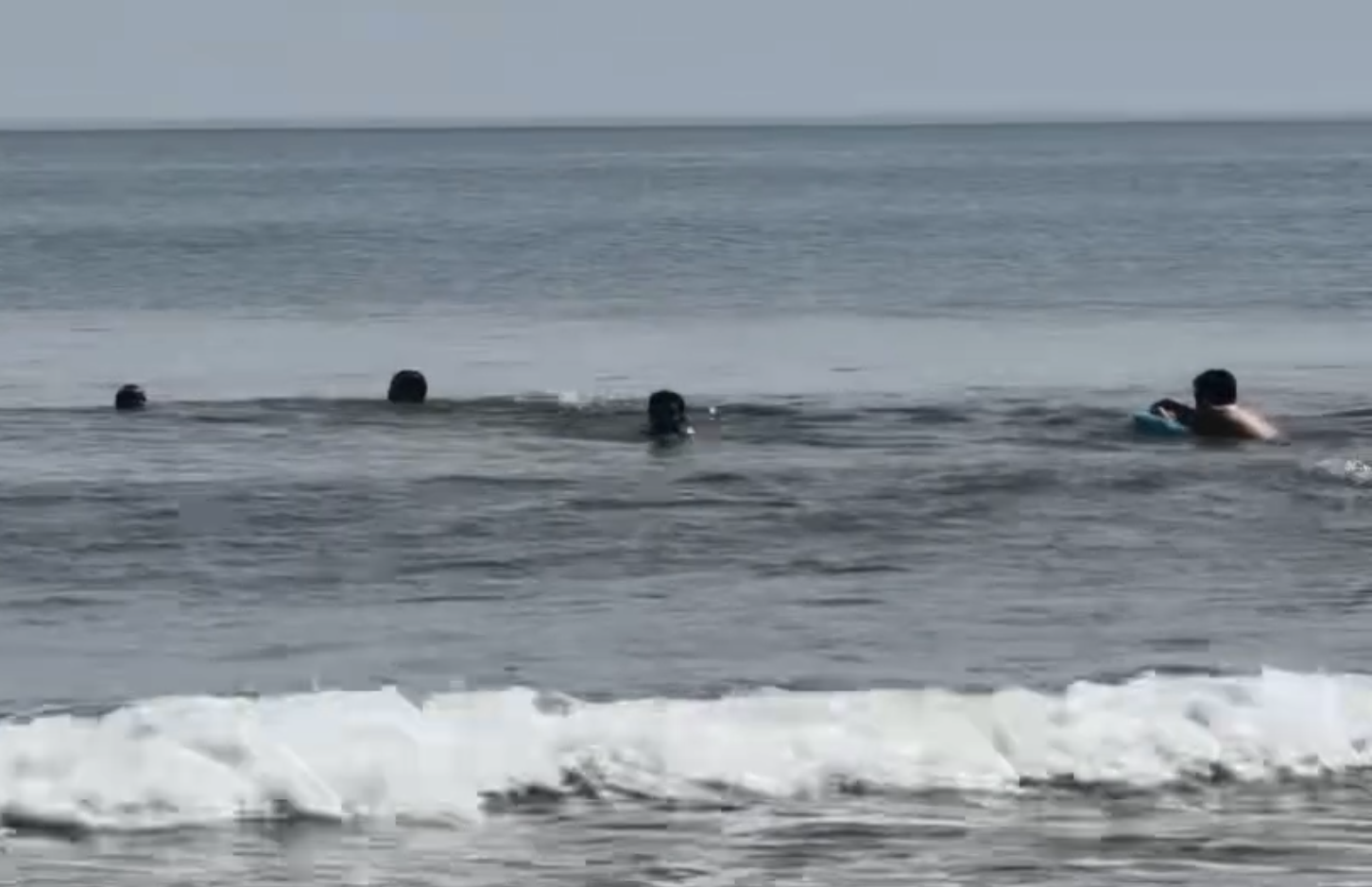 谢清游了大概三十多米,才发现水里有两个溺水儿童,“一个还在水面挣扎,另一个情况更严重,他脸色发紫,看上去失去意识了。”谢清将失去意识的男童推了几步,旁边一个拿着游泳圈游过来的男子接过男童并用泳圈套住。同一时间,罗银也将下水救援但已体力不支的那位父亲拖到泳圈处,与男童一并往岸边送。在近海滩的位置,邓俊德下水接应,合力将溺水者托举上岸。