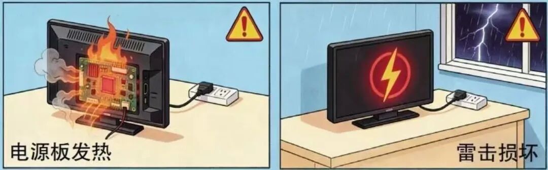 待机时电源板会持续发热,若电视机使用年限久、内部元件老化,或电源线存在破损,再遇上电压波动、雷击等情况,极易引发短路,严重时甚至可能诱发火灾。