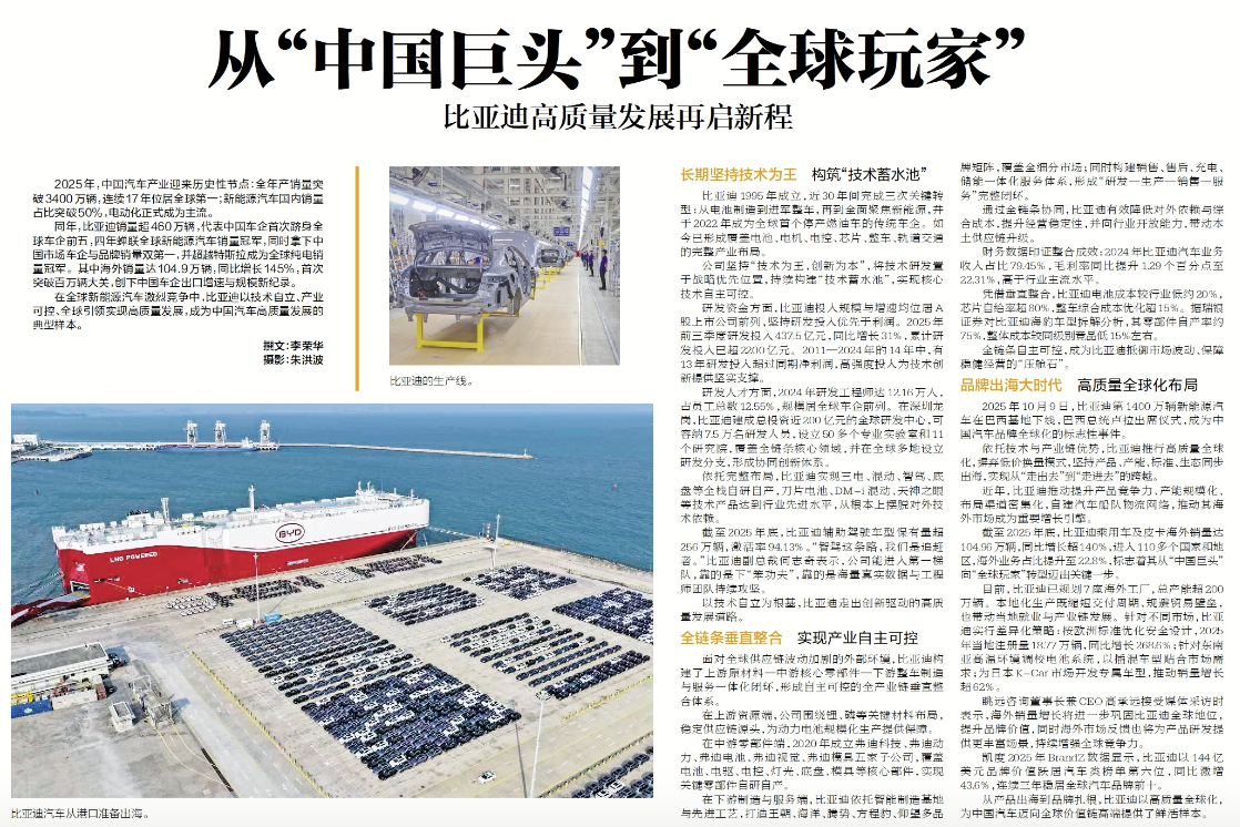 在全球新能源汽车激烈竞争中,比亚迪以技术自立、产业可控、全球引领实现高质量发展,成为中国汽车高质量发展的典型样本。