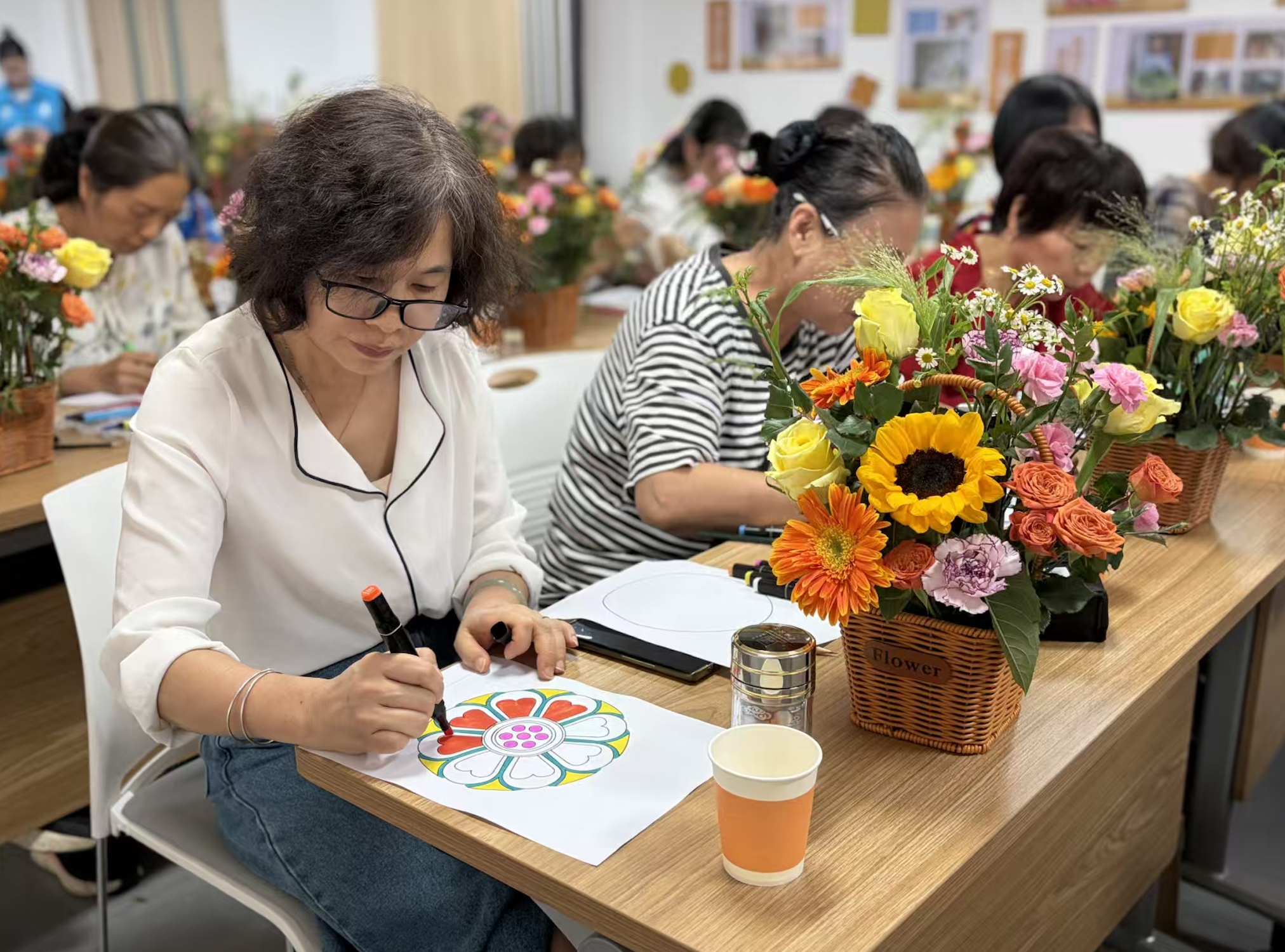 与此同时,“燕邻花叙”主题插花活动也在社区活动室开展。花艺志愿者指导大家修剪枝叶、搭配色彩,专业心理老师则通过疗愈课程、互动游戏,引导女性居民舒缓压力、调节情绪。