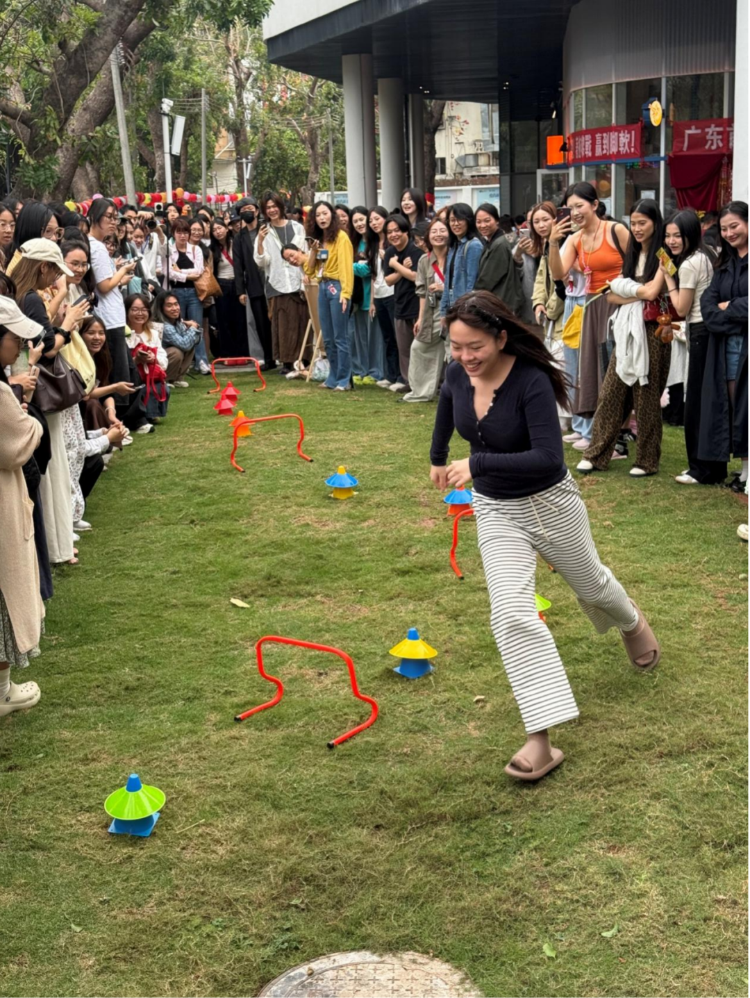 中场休息的15分钟属于游乐时间,靓仔、靓女们穿着拖鞋在户外草坪上大玩障碍穿越跑,拼谁速度最快;或者站在一条白线前,朝前面的九宫格踢出一只拖鞋,拼谁得分最高。最后的福利是,获得okwor主理人cheney设计的粤风十足的文创周边、拖鞋、T恤。