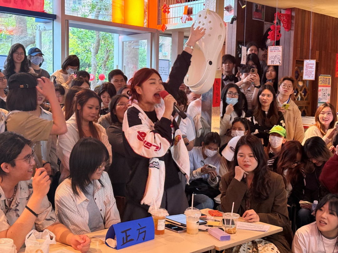 反方主辩“人字拖一世” 被正方的唱跳开场一惊,但作为曾经上过台的年会主持人,她干脆扔下话筒,直接腹式发声:“洞洞鞋绝不是拖鞋!”她脱下脚上的人字拖拍在桌上,“难道你们洗澡的时候会穿洞洞鞋吗?我回到家最舒适的瞬间就是换上这双拖鞋,释放脚趾的疲惫。”